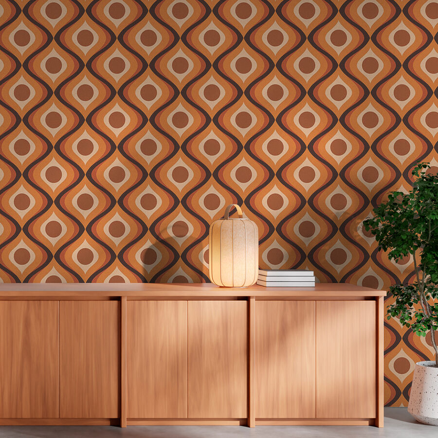 Kijk eens naar deze echt coole geometrische retro muurschildering – een echte vibe! Stel je voor dat die aardse bruintinten en rijke sinaasappels naadloos over je muur vloeien. Het is alsof je teruggaat naar de jaren 70, maar dan veel stijlvoller. Perfect om een woonkamer op te vrolijken, je kantoor wat karakter te geven of zelfs een eigenzinnige draai aan een gang te geven. Stel je voor dat je aan je koffie nipt en je helemaal knus en nostalgisch voelt met dit patroon om je heen. Het is het soort ontwerp waarvan gasten zullen zeggen: “Wow, je muur is prachtig!”. Echt, deze muurschildering is een game-changer. Geloof ons, als hij er eenmaal hangt, wil je hem er niet meer afhalen.