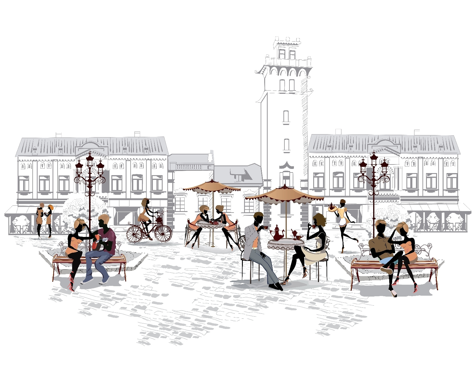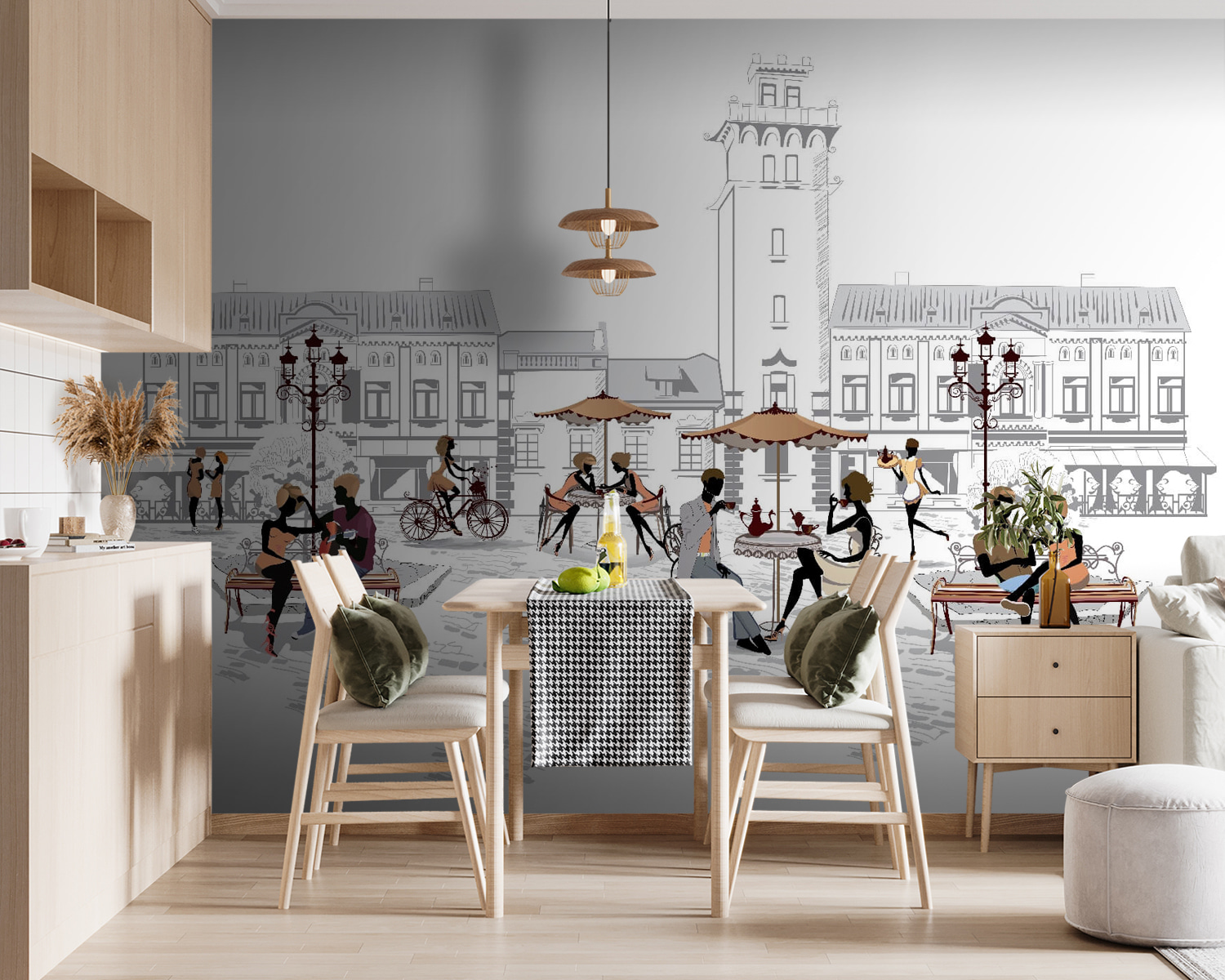 Stel je voor: een charmant straatbeeld dat een stukje leven bij je thuis brengt. Deze muurschildering toont een zonnige dag waarop een man en een vrouw op een gezellig bankje zitten, omringd door het geroezemoes van een druk café. Stel je het gerinkel van koffiekopjes voor, het gelach van vrienden en een zacht briesje dat voorbij waait. Het is perfect voor iedereen die houdt van de sfeer van het stadsleven of gewoon wil ontsnappen naar een schilderachtig moment. Dit werk verwarmt niet alleen een kamer, maar nodigt ook uit tot het delen van verhalen en herinneringen, waardoor gesprekken zoals op de muurschildering op gang komen. Een echte gespreksstarter!