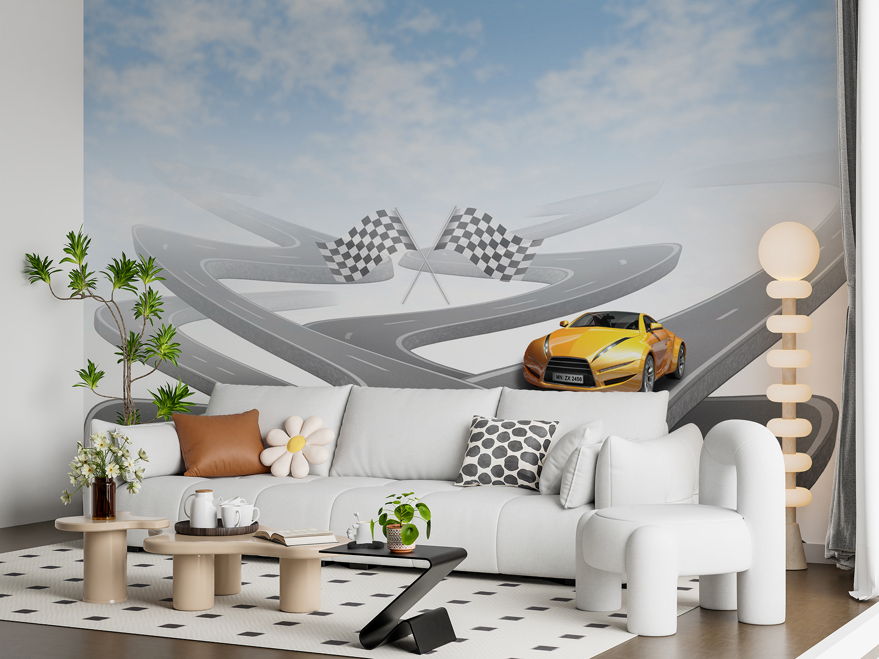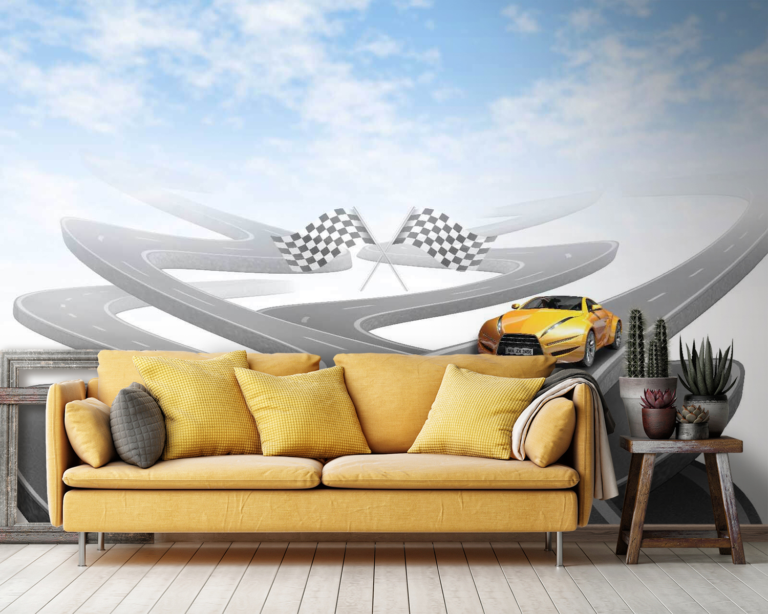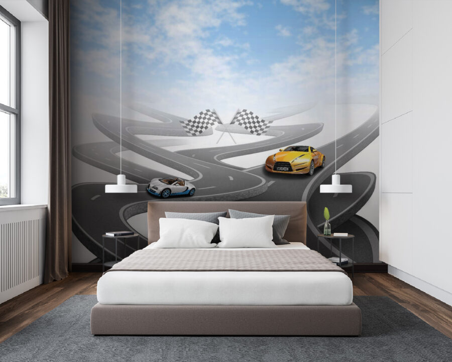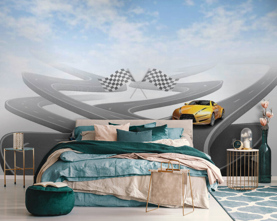 Droom je er wel eens van om in een flitsende sportwagen over kronkelige wegen te scheuren? Met deze muurschildering zit je goed! Met een knalgele sportwagen op een schijnbaar eindeloze, kronkelige weg onder een lucht die zo blauw is dat je muren er misschien wel van gaan leven. Perfect voor autoliefhebbers, kinderen die dromen van raceavonturen of iedereen die houdt van een vleugje opwinding in hun interieur. Stel je de verhalen voor die je kunt verzinnen, zoals racen door de bergen of cruisen langs de kust met de wind in je haren. Het is net een mini-uitstapje aan je muur!