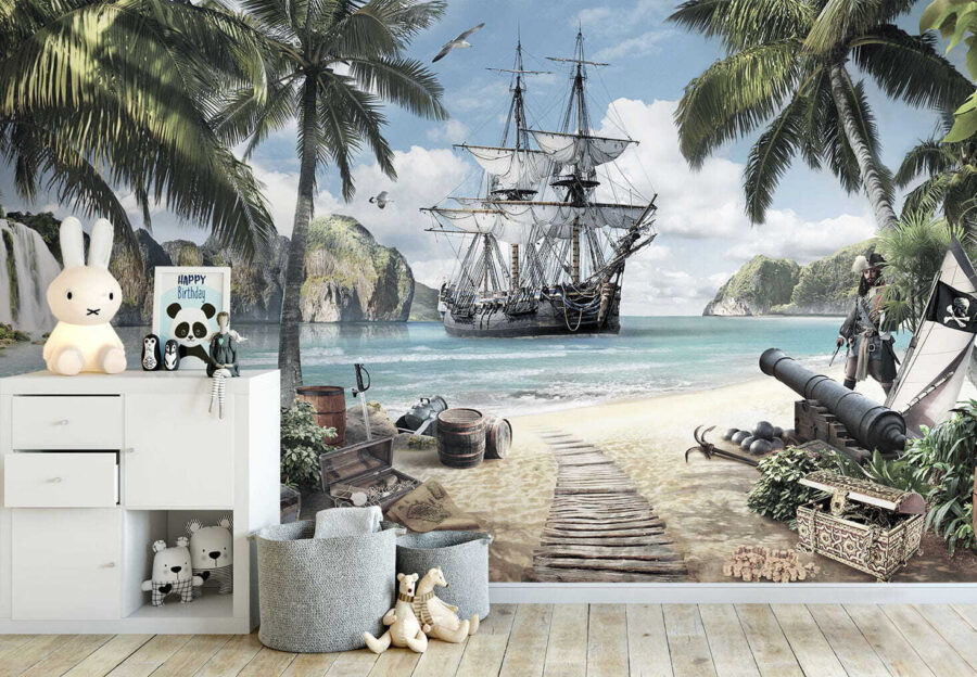 Verander elke ruimte in een zonovergoten paradijs met de “Fotobehang Piratenschip Verankerd door Tropisch Paradijs”. Stel je voor dat je in een wereld stapt waar de zeebries zachtjes over je gezicht strijkt en levendige palmbomen boven je wuiven. Deze muurschildering brengt een prachtig tafereel tot leven – een avontuurlijk piratenschip aangemeerd aan kristalhelder water, omringd door schatten en weelderige natuur. Kinderen zullen het gevoel hebben dat ze deel uitmaken van een avontuurlijke reis op zoek naar verborgen schatten en geheime eilanden. Het is meer dan alleen decor; het is een vonk voor creativiteit, inspirerende verhalen en eindeloze dagdromen. Wie wil er nu niet wegzeilen telkens als hij naar zijn muur kijkt? Deze muurschildering is perfect voor speel- of slaapkamers en creëert een charmante ontsnapping die iedereen doet glimlachen. Laat je verbeelding de vrije loop!