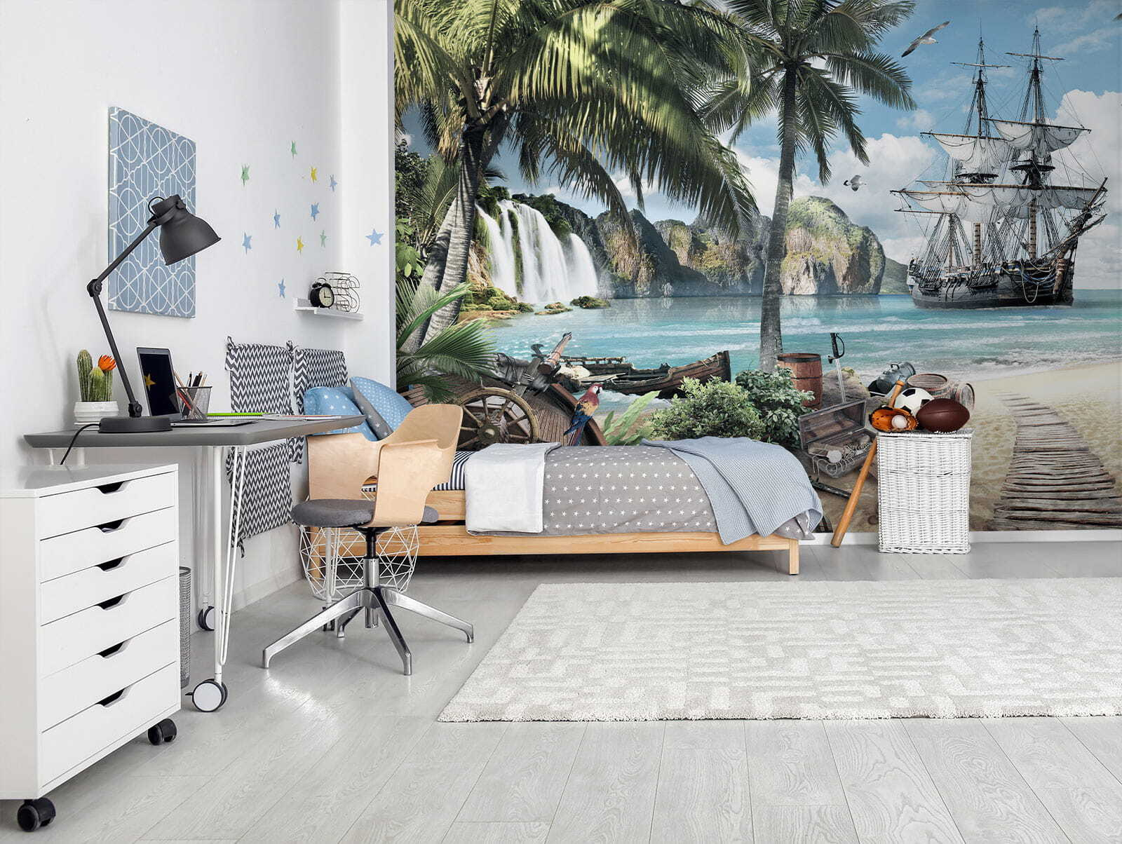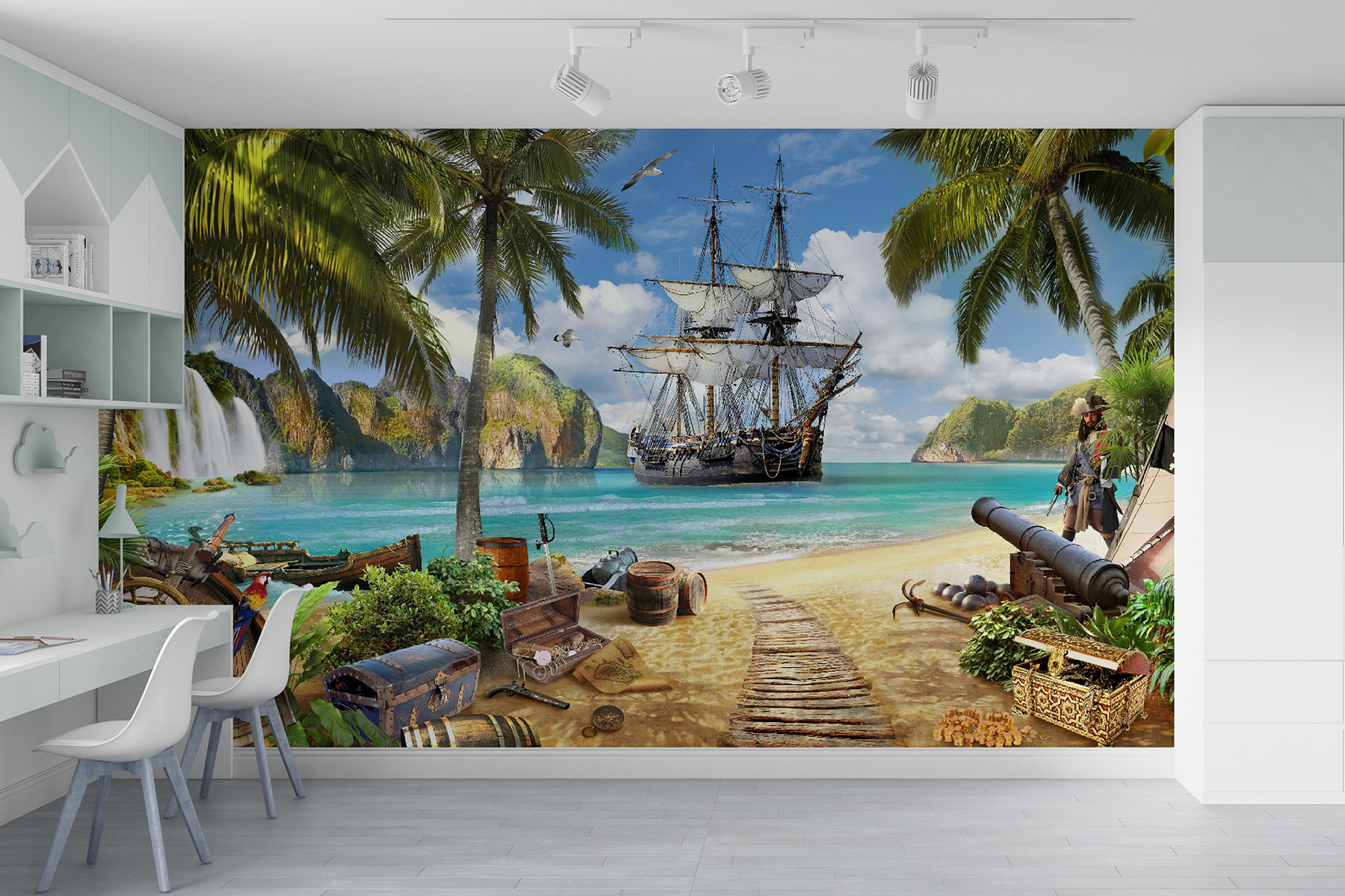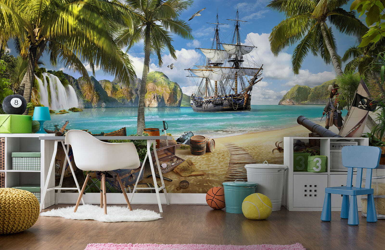 Verander elke ruimte in een zonovergoten paradijs met de “Fotobehang Piratenschip Verankerd door Tropisch Paradijs”. Stel je voor dat je in een wereld stapt waar de zeebries zachtjes over je gezicht strijkt en levendige palmbomen boven je wuiven. Deze muurschildering brengt een prachtig tafereel tot leven – een avontuurlijk piratenschip aangemeerd aan kristalhelder water, omringd door schatten en weelderige natuur. Kinderen zullen het gevoel hebben dat ze deel uitmaken van een avontuurlijke reis op zoek naar verborgen schatten en geheime eilanden. Het is meer dan alleen decor; het is een vonk voor creativiteit, inspirerende verhalen en eindeloze dagdromen. Wie wil er nu niet wegzeilen telkens als hij naar zijn muur kijkt? Deze muurschildering is perfect voor speel- of slaapkamers en creëert een charmante ontsnapping die iedereen doet glimlachen. Laat je verbeelding de vrije loop!