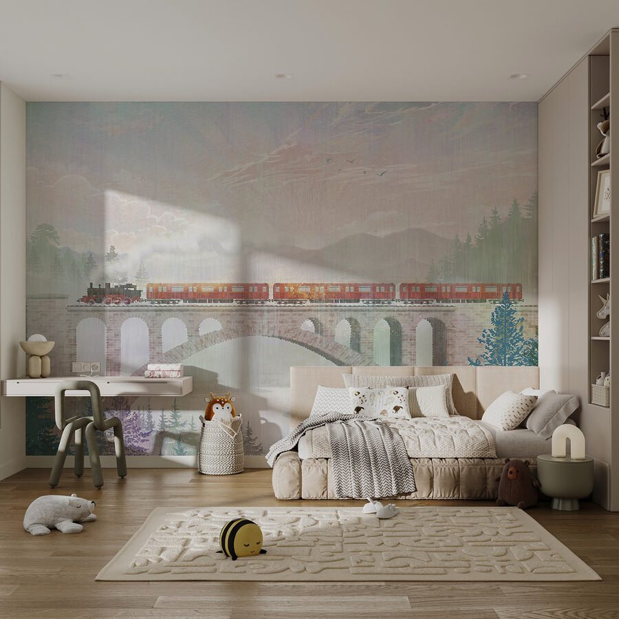 Stel je voor: als je een kamer binnenstapt met deze muurschildering, “Bridge over a River”, voelt het alsof je wordt getransporteerd naar een scène die rechtstreeks afkomstig is van een oude ansichtkaart. Stel je een gezellige middag voor, nippend aan een kopje thee, met deze scène die de muren bijna doet zoemen van nostalgie. De charmante brug en de ronkende trein creëren een serene, bijna sprookjesboekachtige sfeer – perfect voor degenen die hunkeren naar een vleugje avontuur vanuit hun comfortabele huis. Het is niet zomaar een muurschildering; het is een uitnodiging om te dagdromen. De zachte pasteltinten en mistige dennenbomen zorgen voor een rustgevende achtergrond, waardoor het lijkt alsof je de vogeltjes kunt horen fluiten en de frisse ochtenddauw kunt ruiken. Of je nu een die-hard decorliefhebber bent of gewoon iemand die de kleine magische momenten waardeert, deze muurschildering brengt een sfeer van tijdloze reischarme in je kamer. Zet je favoriete muziek aan, werp een blik op deze muurschildering en laat je elke dag meevoeren naar die vredige brug.