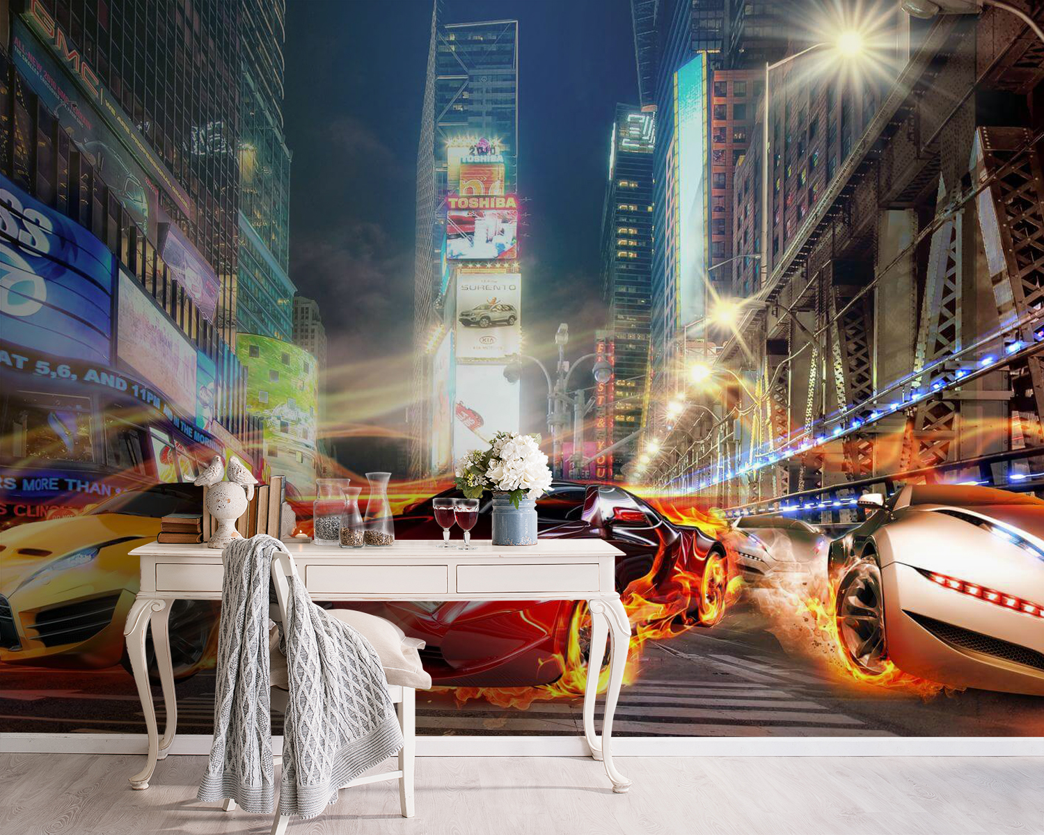 Heb je een kind dat gek is op snelheid of ben je zelf misschien een beetje autogek? Bekijk dan deze waanzinnig coole muurschildering van een rode sportwagen die eruitziet alsof hij in brand staat – letterlijk! Het is alsof je een pitstop maakt midden in een razendsnelle race door het hart van de stad. Stel je eens voor hoe je zoon of dochter zich voelt als een mini-racer telkens als hij of zij zijn of haar kamer binnenstapt. De energie en de vlammen springen bijna van de muur af en wakkeren de adrenaline aan. Perfect voor een speelkamer of een man cave. Maak je klaar voor een serieuze decorstijl!