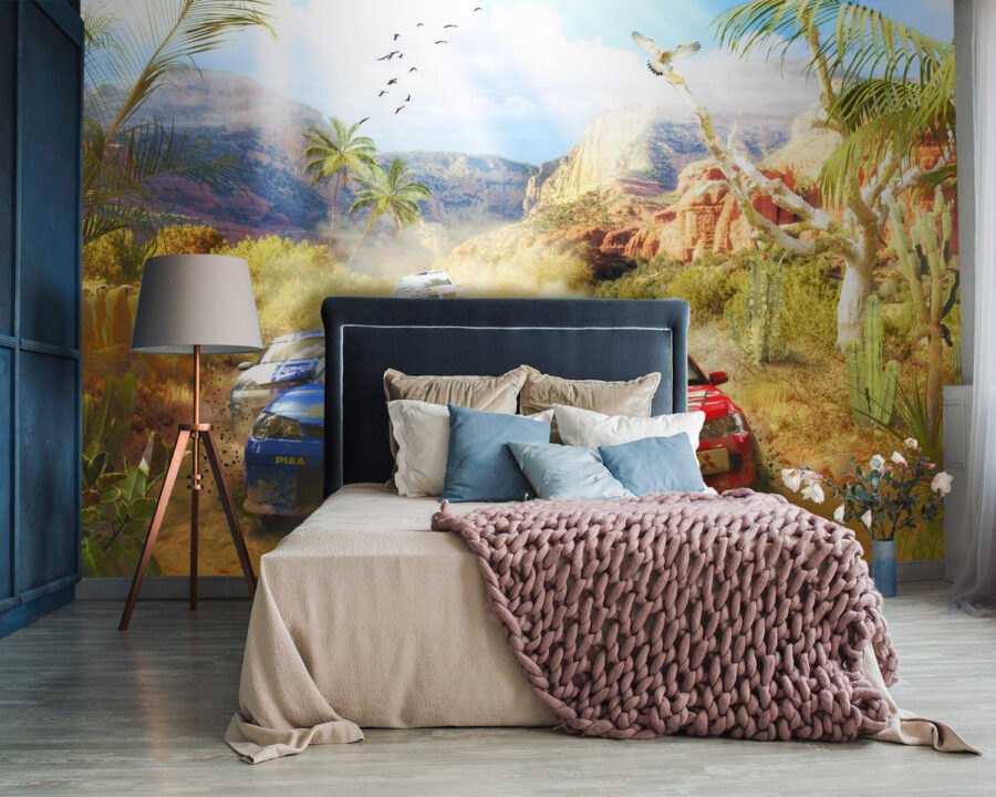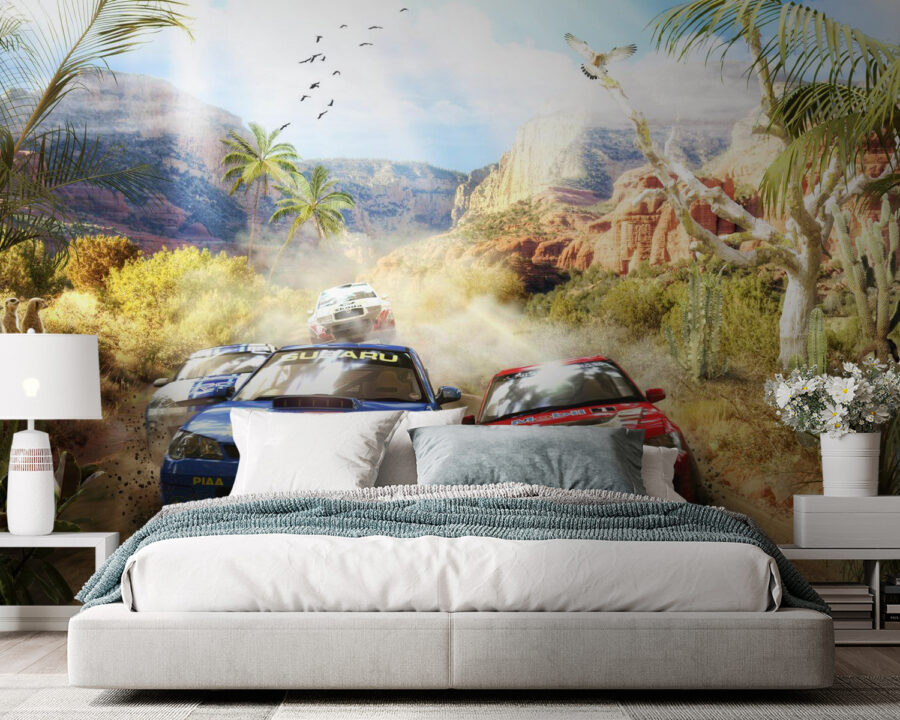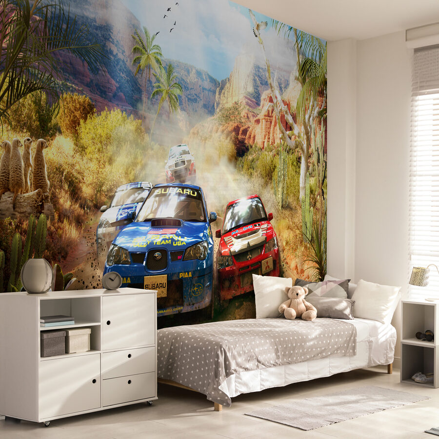 Stel je voor dat je de kamer van je kind binnenloopt en wordt meegenomen op een woestijnavontuur, compleet met rallyauto’s die stof doen opwaaien terwijl ze door ruige ravijnen en saguaro cactussen razen. Deze muurschildering is niet zomaar een spetter van kleur, het is alsof je een venster opent naar een spannende race. Kinderen zullen de opwinding voelen als ze zichzelf achter het stuur zien zitten om door de bochten te navigeren. Dit gaat niet alleen over auto’s, het gaat over de wilde vrijheid van de woestijn, de kameraadschap van een race en het pure plezier van snelheid. Perfect voor kleine avonturiers of racefanaten, het zal zeker je verbeelding prikkelen en misschien zelfs een paar vroom vroom geluiden produceren! En hé, het is niet alleen voor kinderen. Volwassenen zullen misschien ook dagdromen over die kronkelende woestijnpaadjes.