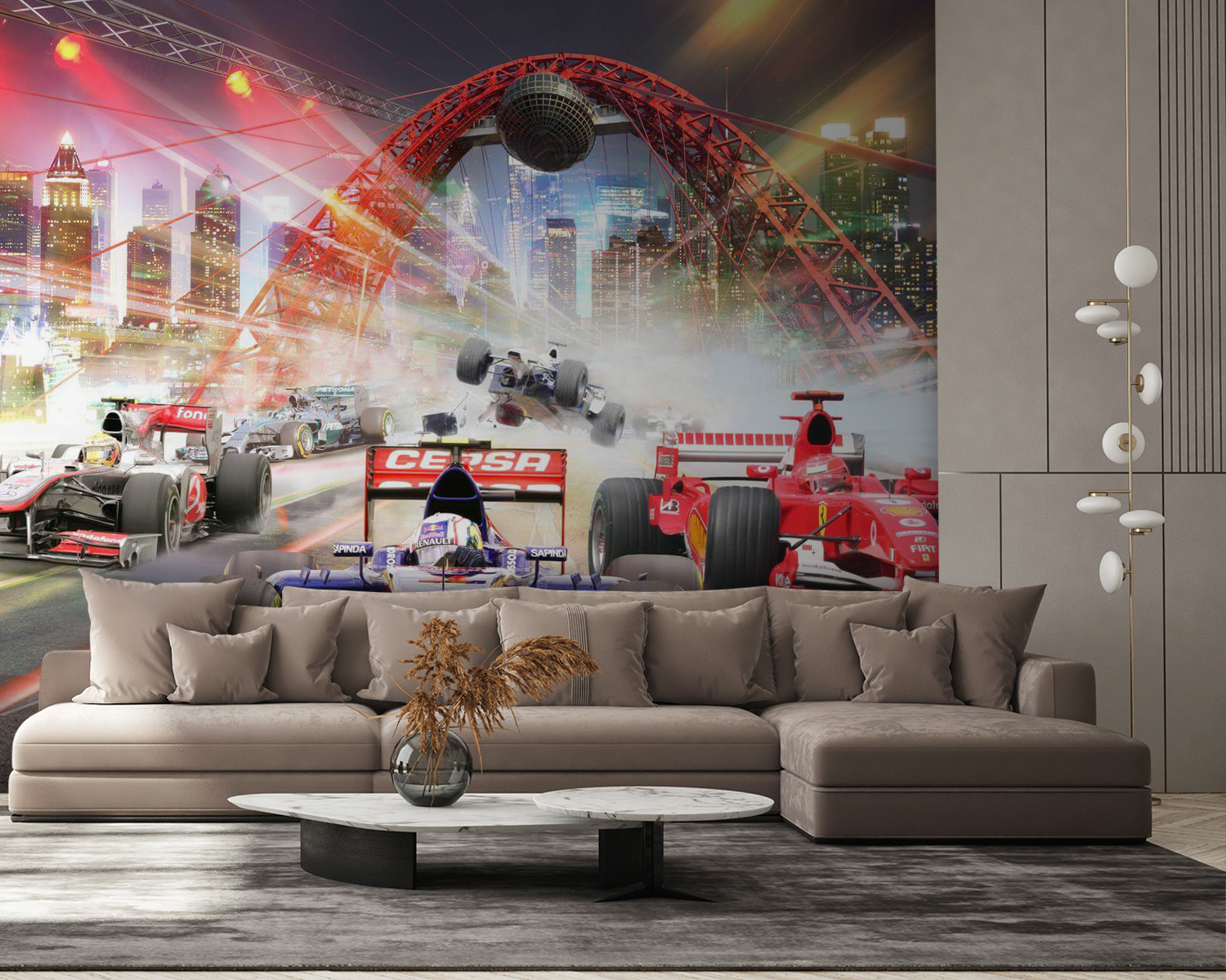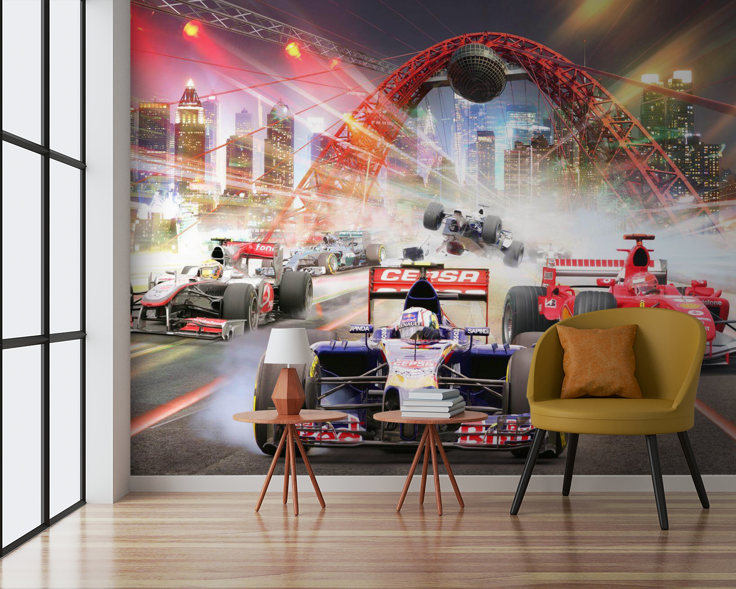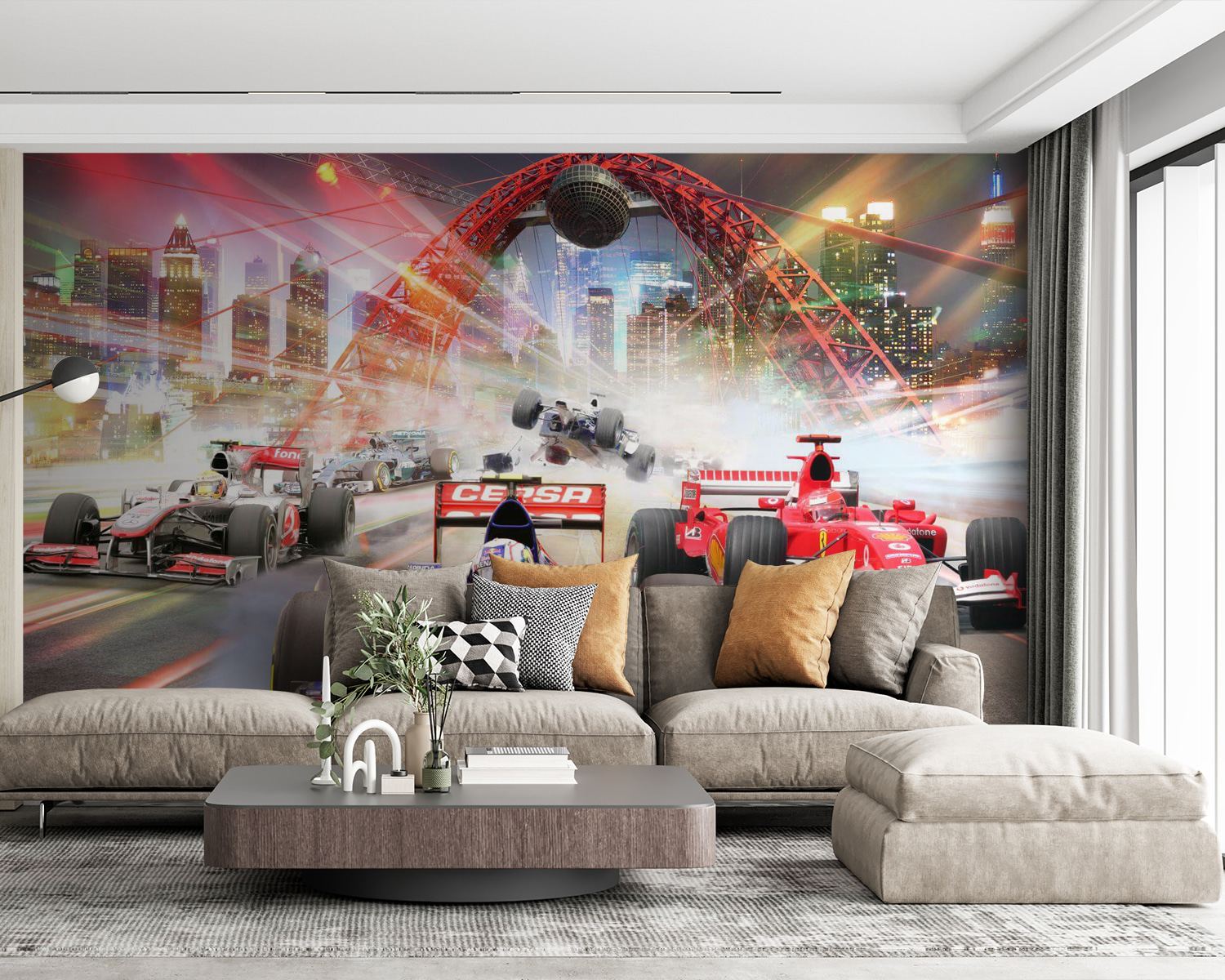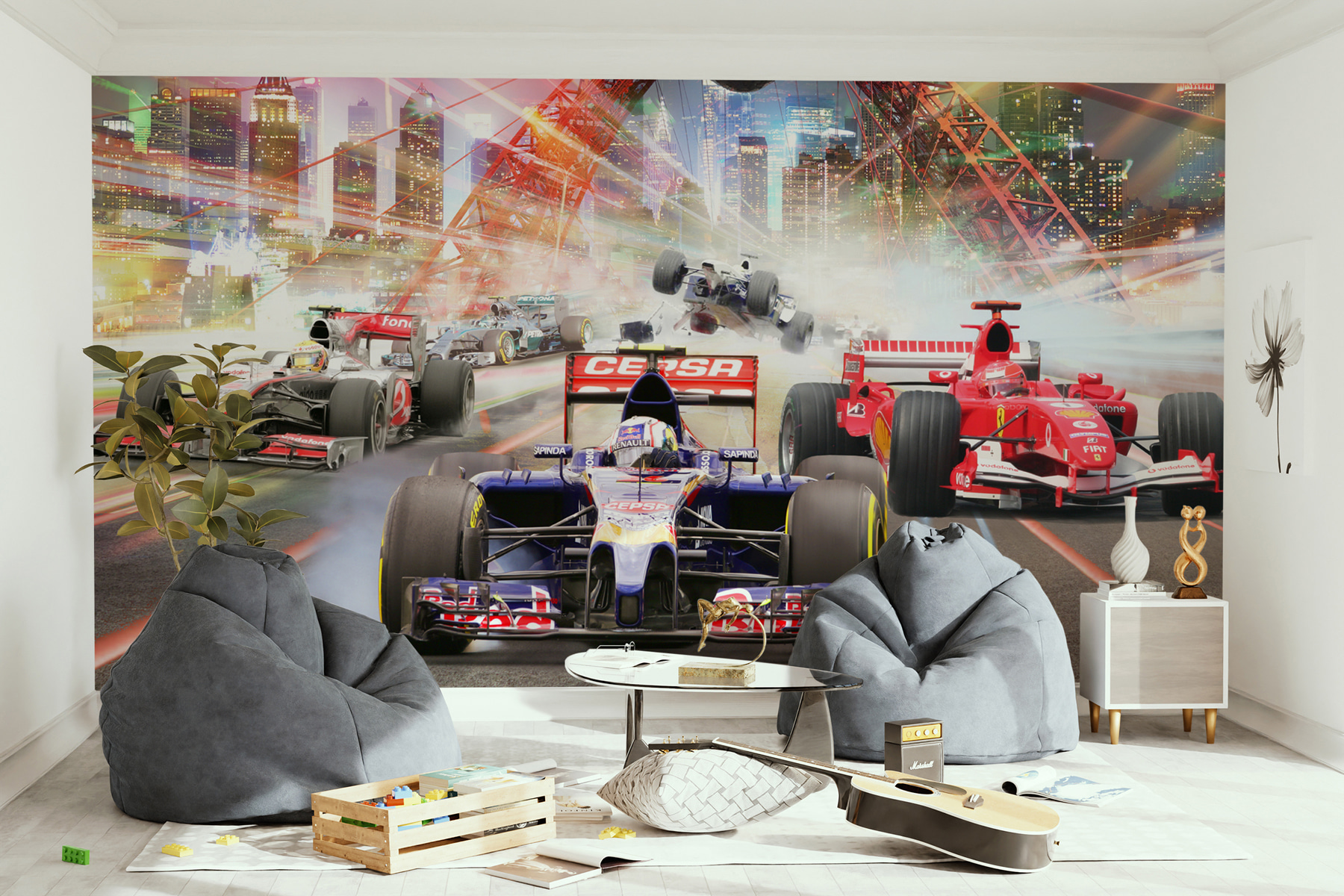 Hoe cool is deze muurschildering? Denk eens aan het opleuken van je ruimte met een epische hogesnelheidsrace dwars door de stad. Stel je de spanning voor van voorbijrazende Formule 1-auto’s, bijna alsof je deel uitmaakt van de actie. Het is perfect voor de kamer van je zoon en geeft een beetje de sfeer van een racebaan weer. Het zit vol met levendige kleuren en veel beweging, wat geweldig is omdat het zo dynamisch is dat je de motoren bijna kunt horen brullen. Je kind of zelfs een autoliefhebber in je leven zou hier dol op zijn. Het is niet alleen voor de show – het brengt een beetje adrenaline in het dagelijks leven. Ideaal om elke ruimte op te vrolijken!