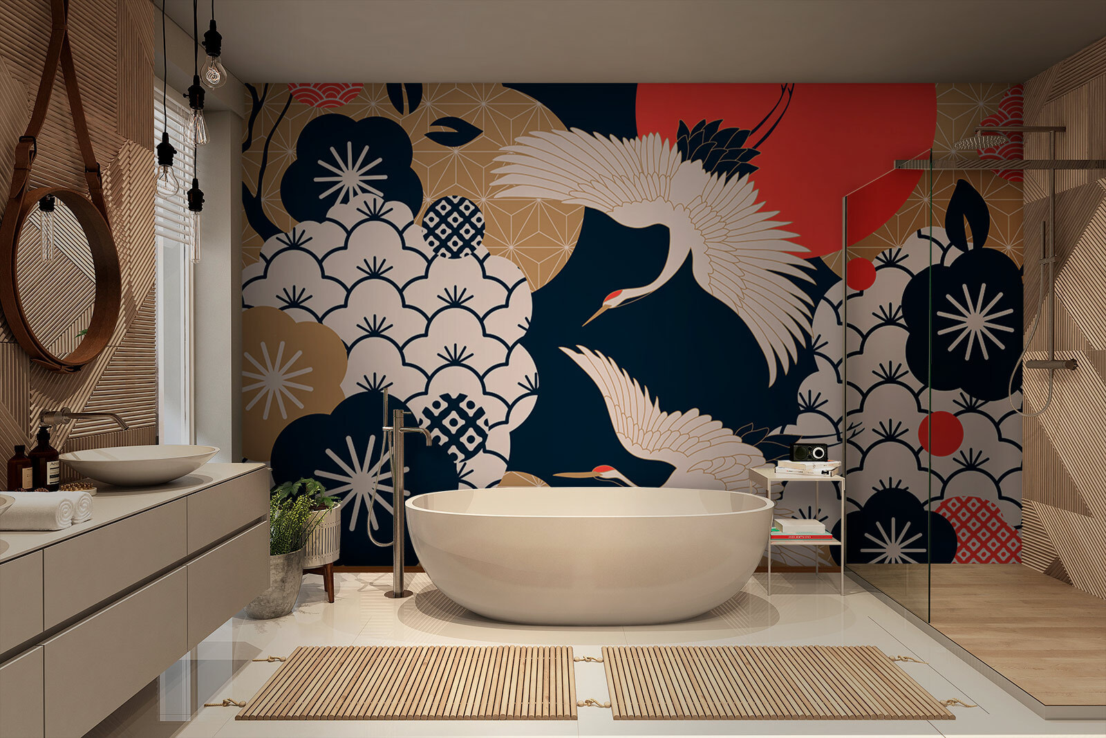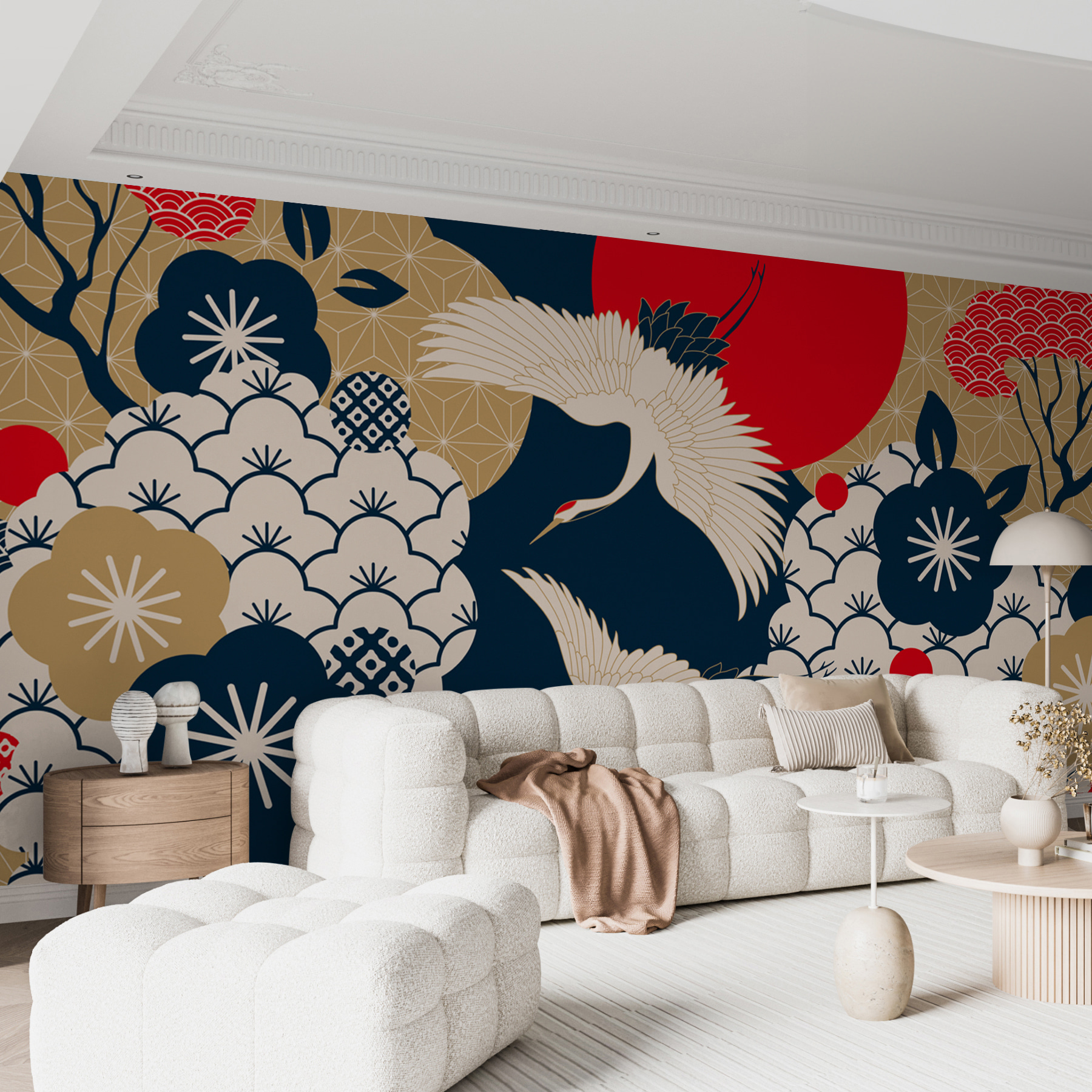 1 beoordeling voor Fotobehang Kraanvogels zweven boven decoratieve bloesems