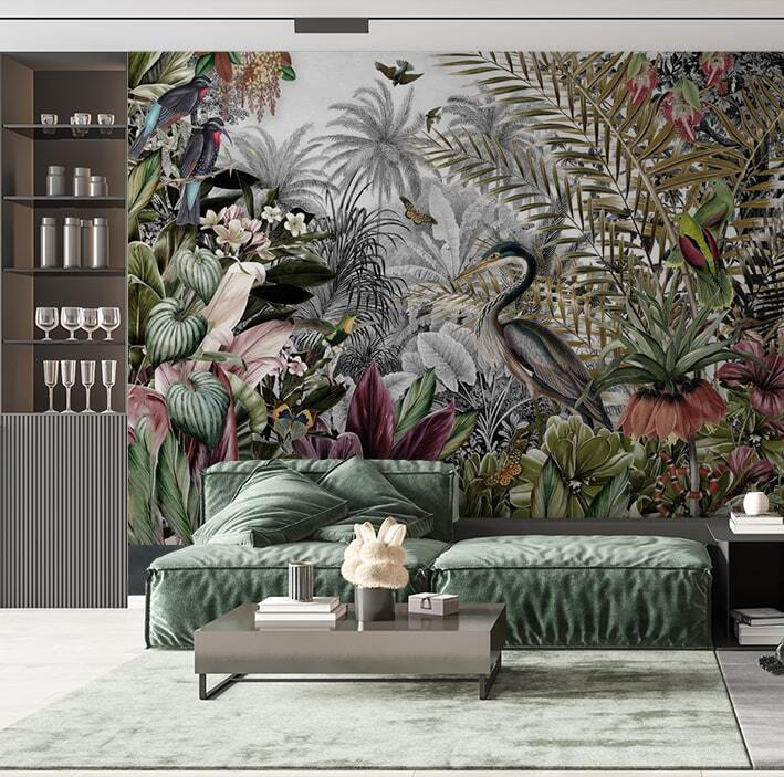 Stap in een levendige oase met deze muurschildering, “Tropisch paradijs met exotische wilde dieren”. Stel je voor dat je ruimte verandert in een weelderig toevluchtsoord waar het gekwetter van kleurrijke vogels en het geritsel van gebladerte de lucht vullen. Deze muurschildering is de perfecte achtergrond voor luie middagen of energieke bijeenkomsten en nodigt uit tot avontuur en rust.