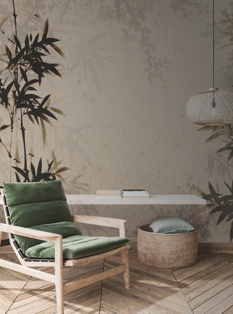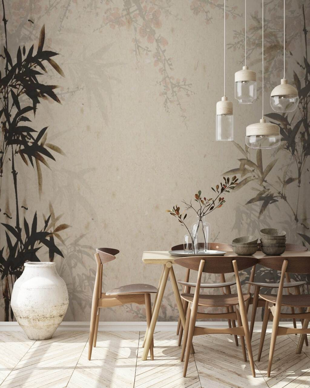 Heb je een lege muur die vraagt om wat persoonlijkheid? Staar dan eens naar deze “Elegant bamboesilhouet op perkament” muurschildering. Het is alsof je een zentuin binnenstapt, zonder te harken! Donkere bamboestengels werpen hun tijdloze schaduwen op een zachte perkamentachtige achtergrond en creëren zo een sfeer die zowel rustgevend als intrigerend artistiek is.