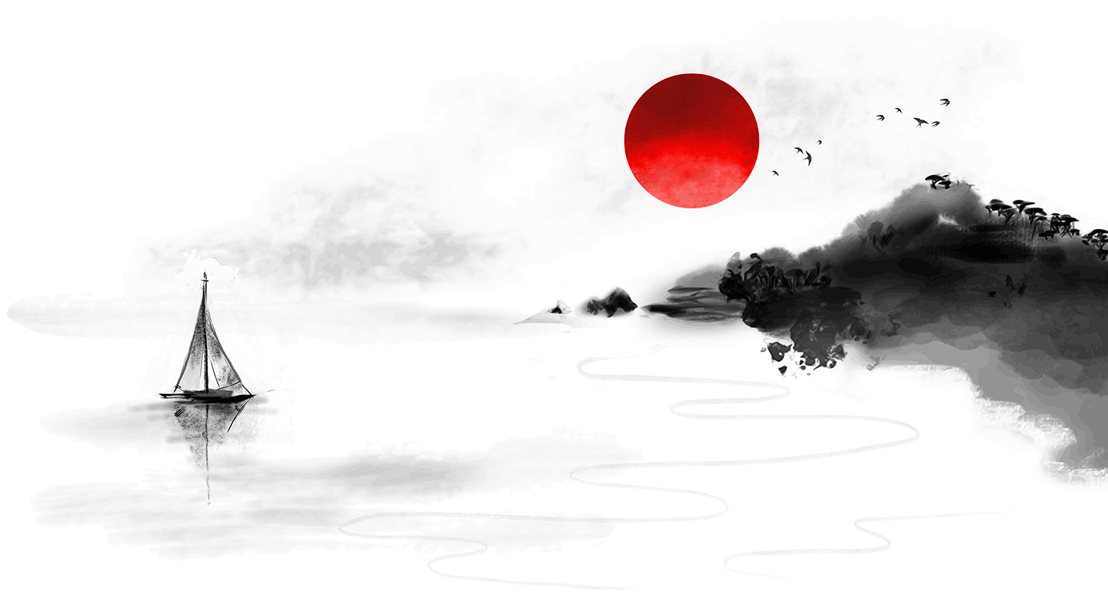 Stel je voor dat je een kamer binnenloopt en begroet wordt door zo’n vredig tafereel – deze dromerige muurschildering toont een rode cirkel tegen een serene witte achtergrond. Het is net je eigen kleine stukje Zen-kunst. De gedurfde, rode zon springt er opvallend uit en biedt een vleugje verkwikkende kleur die moeilijk te negeren is. Combineer dat met het zachte, mistige landschap en je hebt de perfecte balans tussen kalm en levendig.
