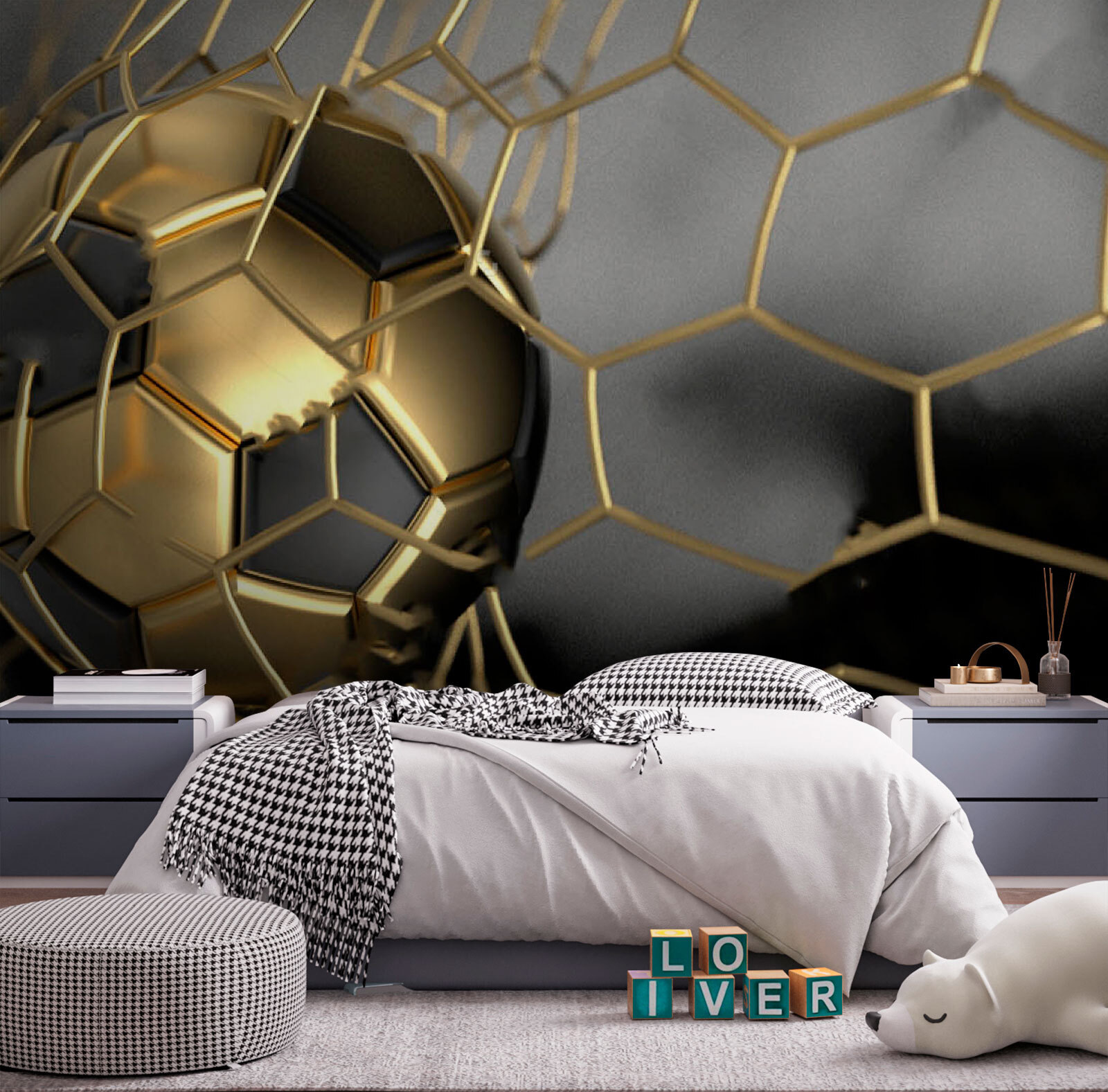Stel je voor dat je een kamer binnenloopt en bam! Je wordt begroet door deze prachtige muurschildering van een voetbal die vastzit in het net-talk about a goal in home decor! “Muurschildering Voetbal gevangen in net” vangt de pure sensatie van dat winnende schot, bevroren in de tijd. Perfect voor elke ruimte waar gepassioneerde voetbalfans samenkomen. Kinderkamers, grotten, zelfs de woonkamer als je familie net zo voetbalgek is als de onze. Het is meer dan alleen behang, het is net alsof je je eigen persoonlijke sporthoogtepunt hebt, dat energie en opwinding in je ruimte brengt. Bij elke blik die je erop werpt, hoor je het publiek bijna brullen en voel je die adrenalinestoot – misschien oefen je zelfs wel je eigen overwinningsdans. Het is gedurfd, dynamisch en gegarandeerd een gespreksonderwerp. Breng wat sportiviteit in je leven; ga ervoor, scoor die hattrick!