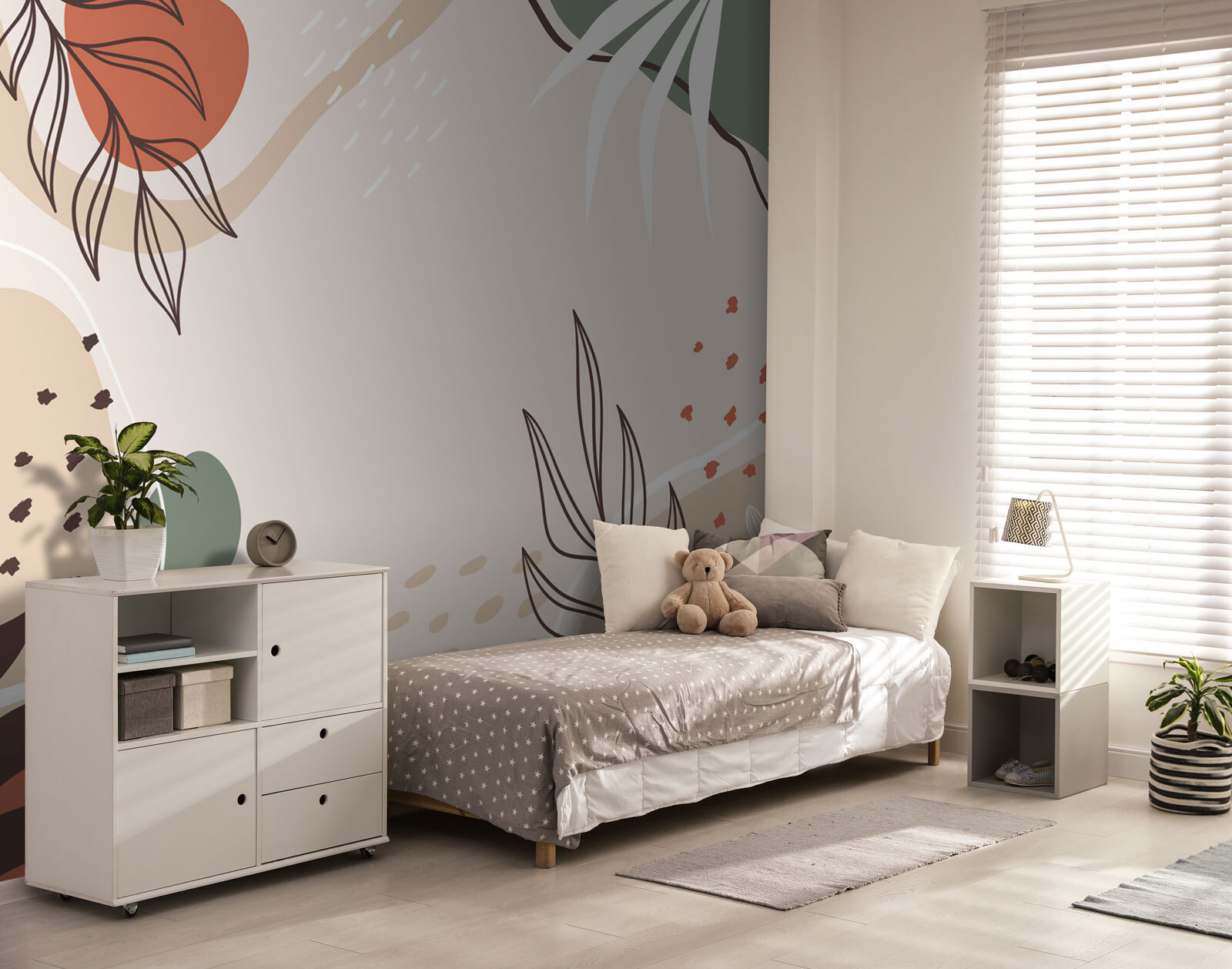 En die aardetinten – de groentinten, bruintinten en warme roodbruine tinten – die trekken je gewoon naar binnen, nietwaar? Het is alsof je in een grillig bos bent, zonder de insectenbeten. Deze muurschildering heeft een subtiele manier om een kamer te transformeren, waardoor het gezelliger en uitnodigender aanvoelt, als een warme knuffel van Moeder Natuur zelf. Stel je dit eens voor in je woonkamer of misschien in je slaapkamer – ergens waar je lekker achterover kunt leunen en je gedachten de vrije loop kunt laten.