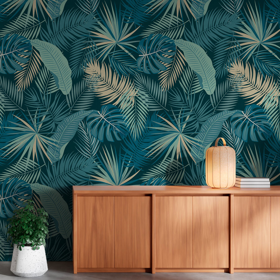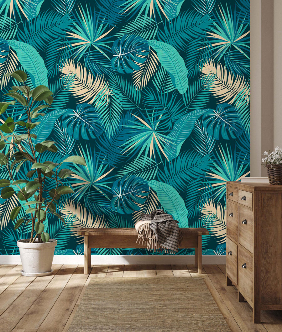 Deze muurschildering met levendig tropisch patroon is de perfecte oppepper waar je kamer naar snakt. Stel je voor dat je in een weelderige, levendige jungle stapt telkens als je je kamer binnenloopt – een exotische ontsnapping, nietwaar? Vol met levendige groene bladeren en rustgevende blauwtinten voelt dit ontwerp aan als een warme, zonnige dag, zelfs als het buiten somber is.