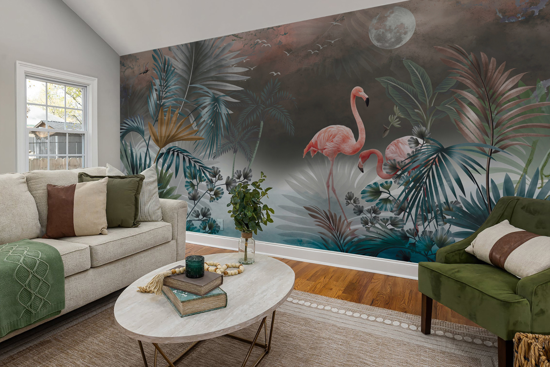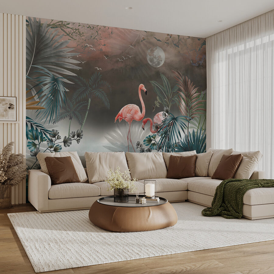 Verander elke ruimte in een tropische ontsnapping met deze prachtige muurschildering met flamingo’s te midden van een sereen paradijs. Stel je voor dat je vanuit je woonkamer of werkruimte een dromerig toevluchtsoord binnenstapt. De zachte tinten en het weelderige groen geven het gevoel alsof er een zacht briesje waait, terwijl de vrolijke flamingo’s rondhuppelen en een vleugje vreugde toevoegen. Deze muurschildering is niet zomaar behang; het is een conversatiestarter, een stukje natuur dat je doet denken aan die onvergetelijke strandvakantie. Perfect om een rustgevende sfeer te creëren, of het nu voor een gezellig hoekje of een levendige eethoek is. Dus, ga je gang – laat de tropen naar je toe komen!