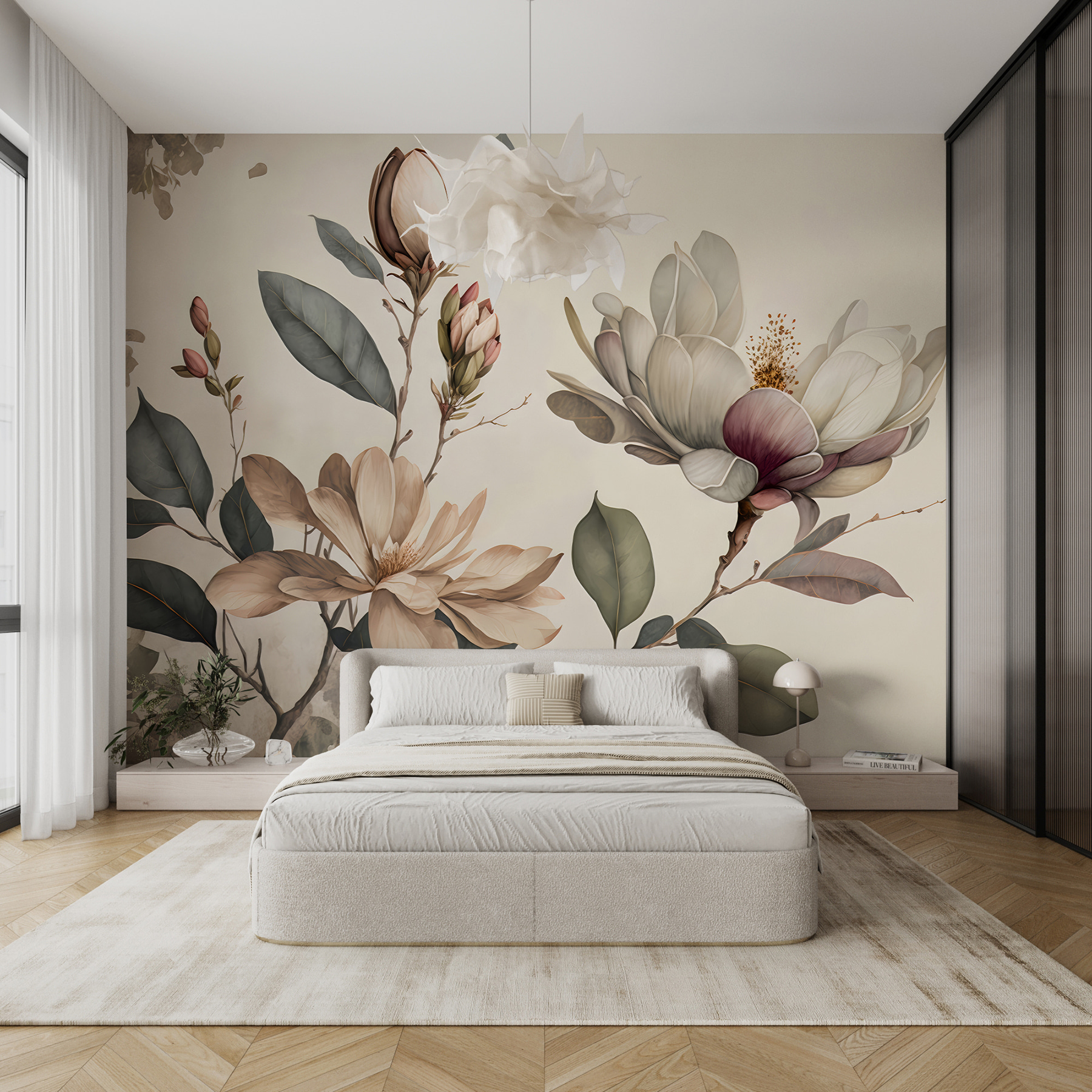 Magnolia bloemen brengen gratie en elegantie in elke kamer, nietwaar? Deze muurschildering is alsof je een stukje serene natuur in je woonruimte hebt. Perfect om een vleugje verfijning toe te voegen zonder te overdrijven. Stel je voor dat je een kamer binnenloopt en begroet wordt door deze zachte bloemen. Het is als een warme knuffel van Moeder Natuur. Of het nu de woonkamer, slaapkamer of zelfs een gezellige leeshoek is – dit zal iedereen die binnenkomt charmeren. En wie geniet er nu niet van een dagelijkse dosis bloemenpracht?