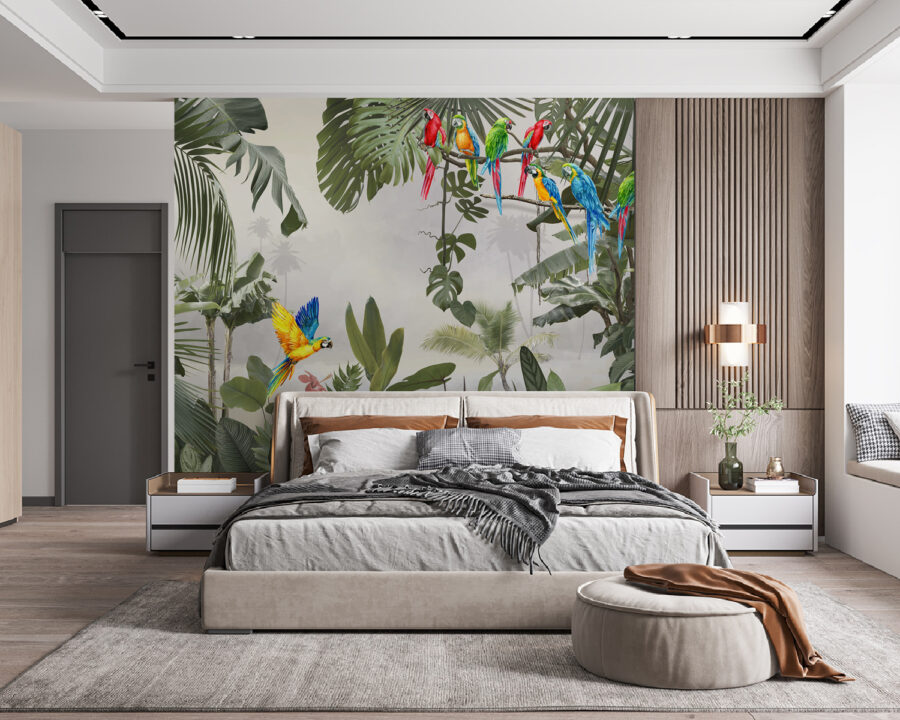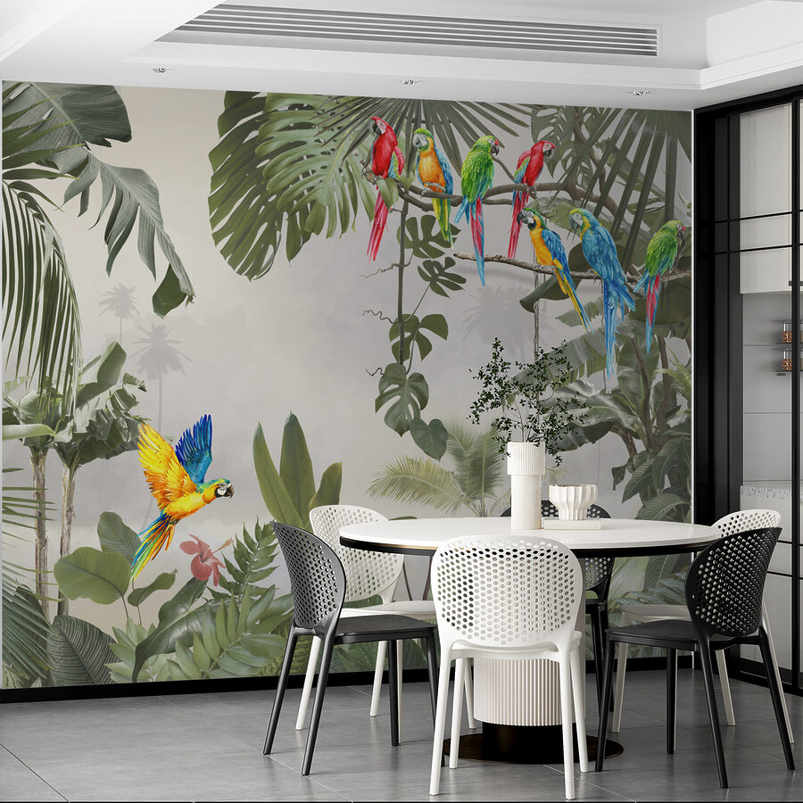 Ooit gedacht aan een tropisch paradijs in je woonkamer? Deze muurschildering met een prachtige blauwe en gele papegaai op een tak zou wel eens de perfecte oplossing kunnen zijn. Stel je de levendige kleuren en ingewikkelde details voor die je ruimte direct opfleuren – het is net een minivakantie telkens als je de kamer binnenloopt. De mix van groene bladeren en de knallen van kleur van de papegaaien geven het geheel een levendig en exotisch gevoel. Perfecte gespreksstarter ook. (Of het nu voor een speciale muur in je woonkamer, slaapkamer of zelfs een werkruimte is, deze muurschildering verandert elke gewone muur in een adembenemende ontsnapping. Het voelt alsof je een tropische jungle bent binnengestapt, gewoon vanuit je luie stoel. Vooruit, laat je muren een verhaal vertellen!