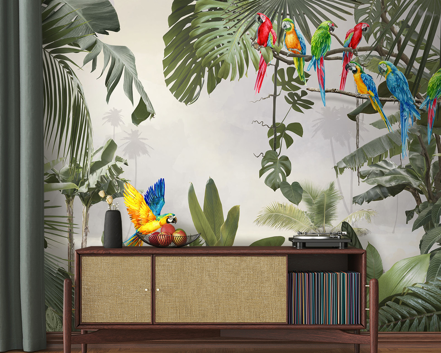 Ooit gedacht aan een tropisch paradijs in je woonkamer? Deze muurschildering met een prachtige blauwe en gele papegaai op een tak zou wel eens de perfecte oplossing kunnen zijn. Stel je de levendige kleuren en ingewikkelde details voor die je ruimte direct opfleuren – het is net een minivakantie telkens als je de kamer binnenloopt. De mix van groene bladeren en de knallen van kleur van de papegaaien geven het geheel een levendig en exotisch gevoel. Perfecte gespreksstarter ook. (Of het nu voor een speciale muur in je woonkamer, slaapkamer of zelfs een werkruimte is, deze muurschildering verandert elke gewone muur in een adembenemende ontsnapping. Het voelt alsof je een tropische jungle bent binnengestapt, gewoon vanuit je luie stoel. Vooruit, laat je muren een verhaal vertellen!