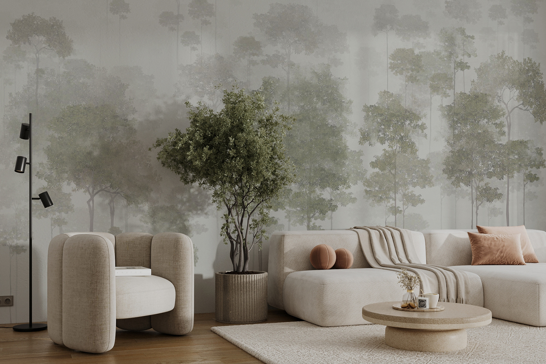 Stel je voor dat je een sereen bos binnenstapt telkens als je de kamer binnenloopt. Deze muurschildering van bomen in een mistig bos doet precies dat. De mistige achtergrond geeft het gevoel alsof de natuur zachtjes is ingepakt in een knusse deken en nodigt uit tot een gevoel van rust en vrede. Kun je je voorstellen dat je je oprolt met een boek onder de zachte verlichting? Of misschien net doen alsof je koffie drinkt terwijl je de bladeren ziet dansen in de bries – gewoon vanuit je woonkamer? Het is een perfect accent voor een moderne ruimte of zelfs een knus hoekje. Haal het buitenleven naar binnen en laat de rust je alledaagse sfeer versterken.
