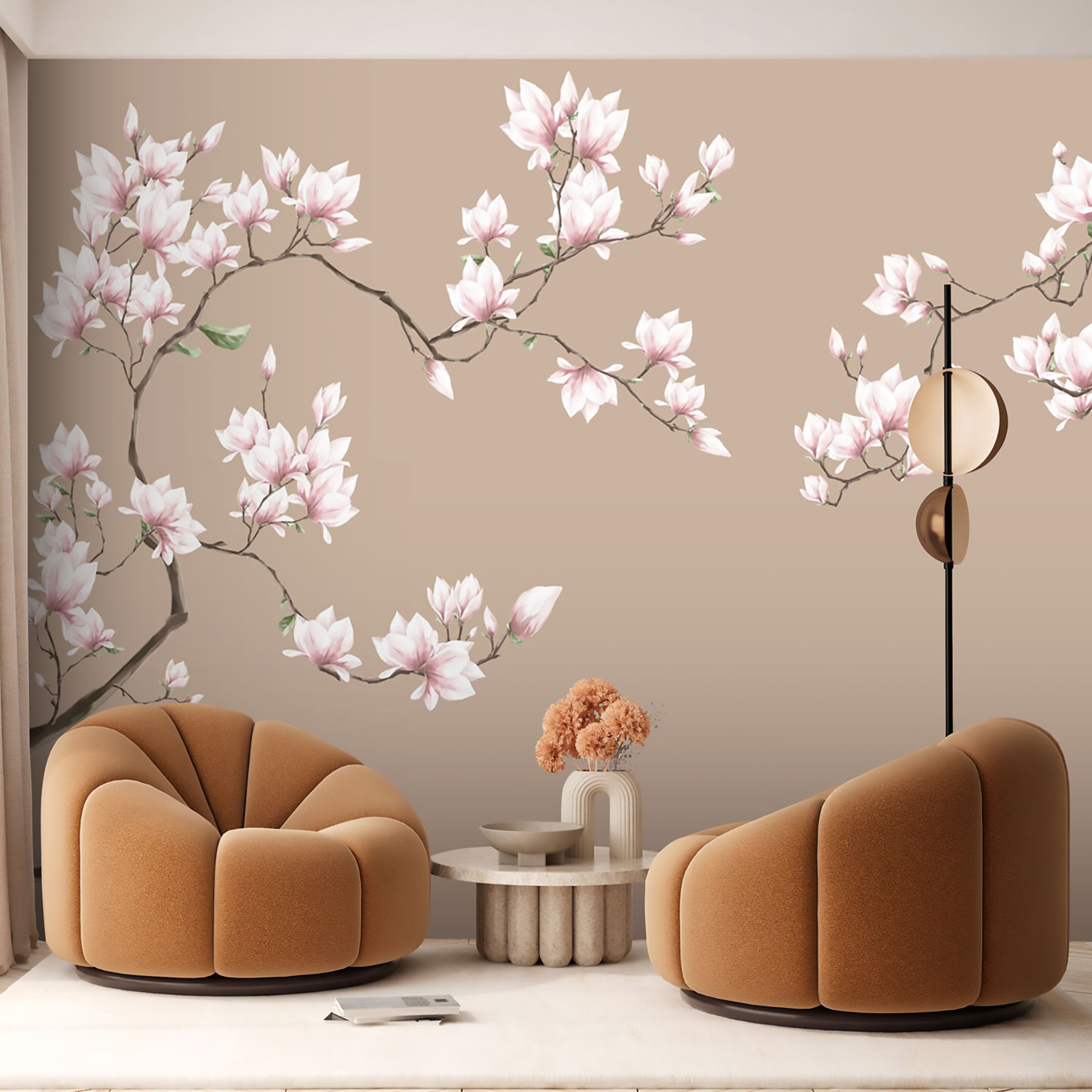 Transformeer je ruimte met de betoverende Fotobehang Blooming Magnolia Branches in Pastel! Stel je eens voor dat je een kamer binnenstapt waar de delicate magnolia bloesems over de muren wapperen en direct de sfeer verhogen. Het zachte pastelkleurige palet straalt warmte en rust uit, perfect voor die gezellige leeshoek of zelfs een levendige woonkamer.
