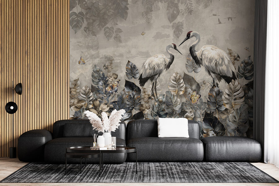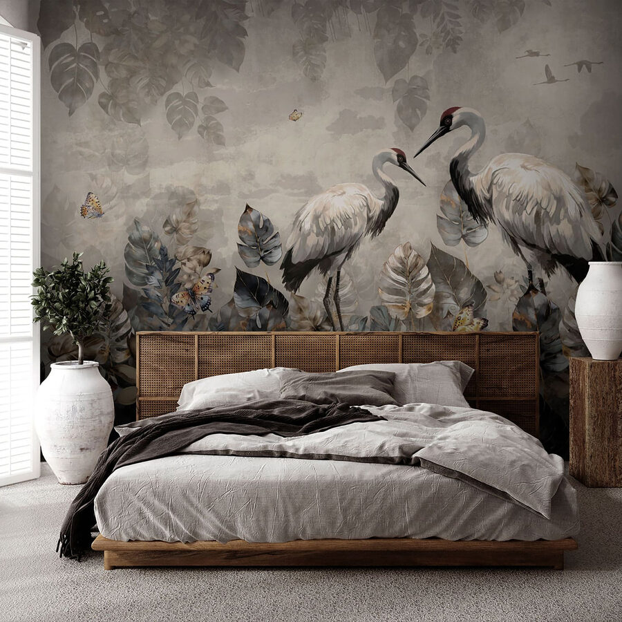 Stel je voor dat je wakker wordt, je uitrekt en geniet van de serene aanblik van twee kraanvogels op je muur. Deze muurschildering is meer dan alleen decoratie; het is alsof je een stukje natuurpoëzie in huis haalt. Het danst tussen stemmig blauw en aards grijs, met die vlinders die fladderen rond bladeren die eruit zien alsof ze zijn gekust door de late herfst.