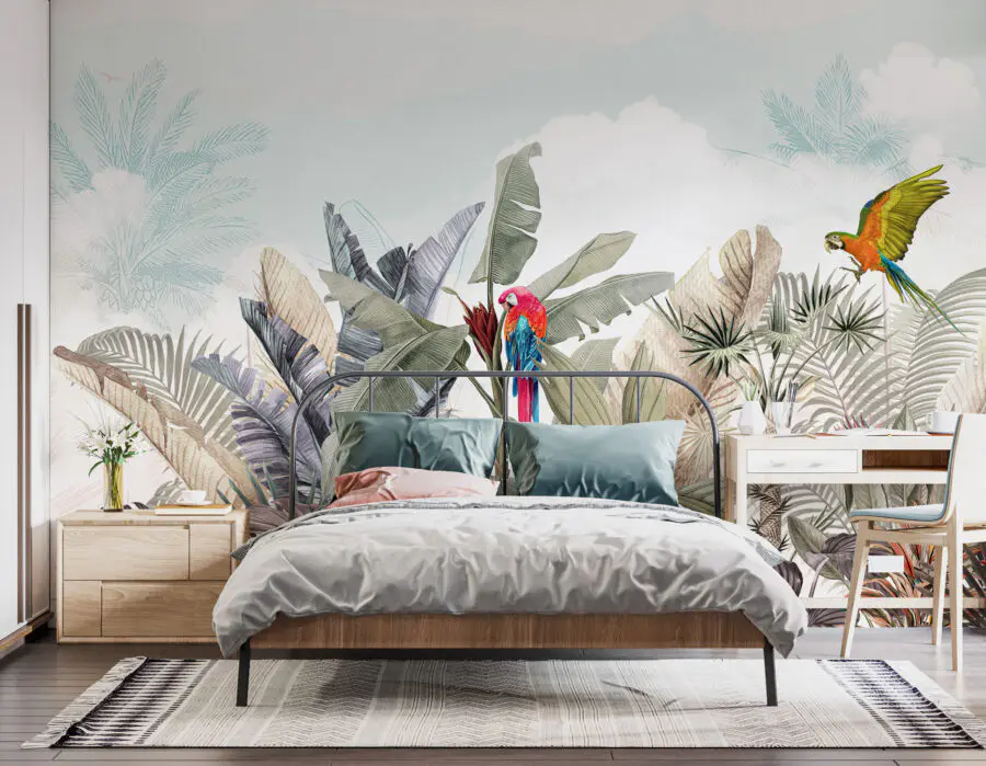 Maak kennis met je nieuwe muurobsessie: de muurschildering “Colorful Parrot Flying in the Air”. Het is alsof de droom van een vogelaar midden in je woonkamer belandt! Stel je twee levendige papegaaien voor die over bladgroen en tropische bloemen zweven. Het is net een minivakantie in het regenwoud – gelukkig zonder de muggen!