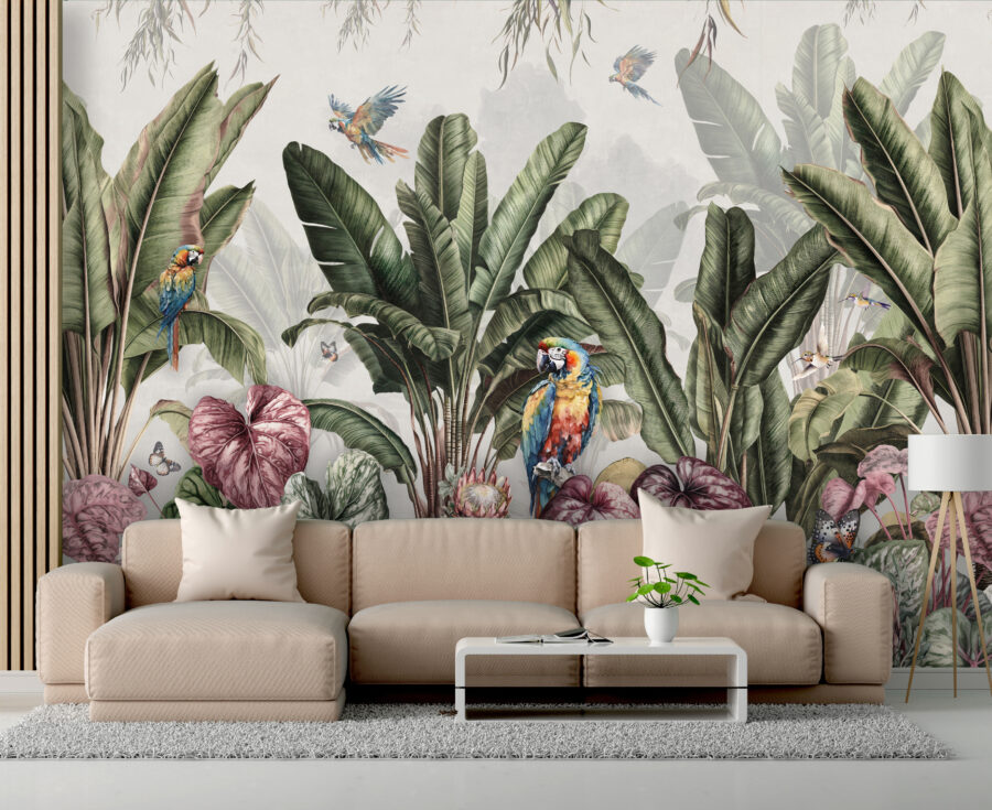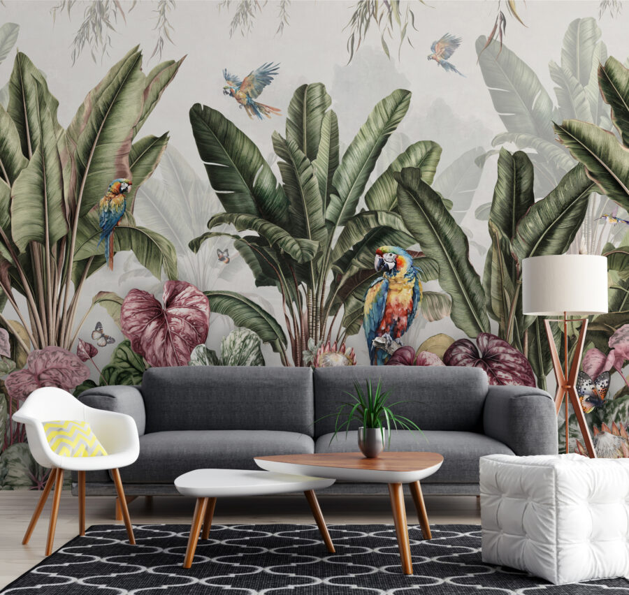 Stel je voor dat je een kamer binnenstapt en je meteen in een weelderig paradijs waant. Dat is precies wat er gebeurt met de muurschildering “Tropisch paradijs met kleurrijke papegaaien”. Levendige papegaaien, exotische planten en vlinders die bijna van de muur af fladderen – het is net een mini-vakantie zonder een tas in te pakken! Of je nu een vermoeide ruimte wilt opfleuren of een beetje eigenzinnigheid in je dagelijkse leven wilt brengen, met deze muurschildering zit je goed. Perfect voor die regenachtige dagen waarop een vleugje kleur en een vleugje natuur net zijn wat je nodig hebt. Zie het als je eigen stukje paradijs thuis.