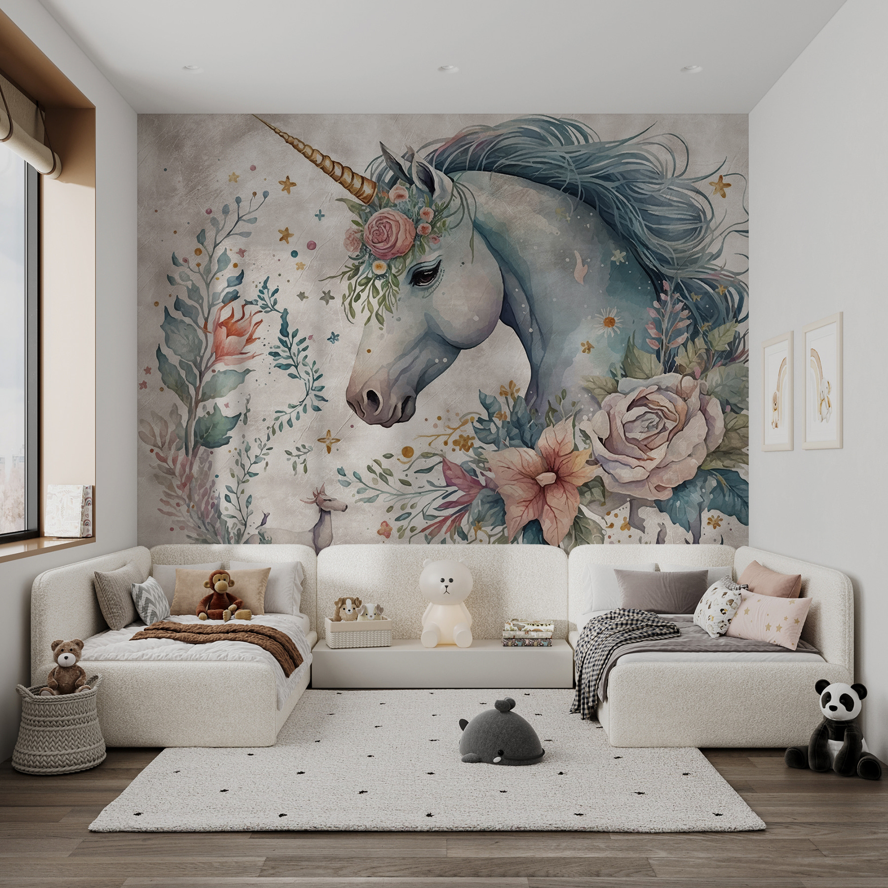 Stel je voor dat je een kamer binnenstapt en begroet wordt door een prachtige, zachte eenhoorn versierd met delicate bloemen – ja, dat is wat deze betoverende muurschildering doet. Perfect voor een kinderkamer of zelfs een grillig leeshoekje, het is alsof je een sprookje tot leven brengt op je muur. Je kunt de magie in de lucht bijna voelen, met die subtiele pasteltinten en ingewikkelde bloemendetails. Het is niet zomaar een decoratie; het is een ervaring. Vrienden die langskomen, kunnen zich verliezen in die dromerige details en telkens als ze kijken nieuwe bloemen of sterren vinden! Bovendien is het een geweldige gespreksstarter. Kinderen? Die zullen in de wolken zijn: verhaaltjes voor het slapen gaan hebben nu een magische achtergrond. Deze muurschildering is als een toverfee voor je muur, die overal waar hij komt sprookjesstof strooit. ✨