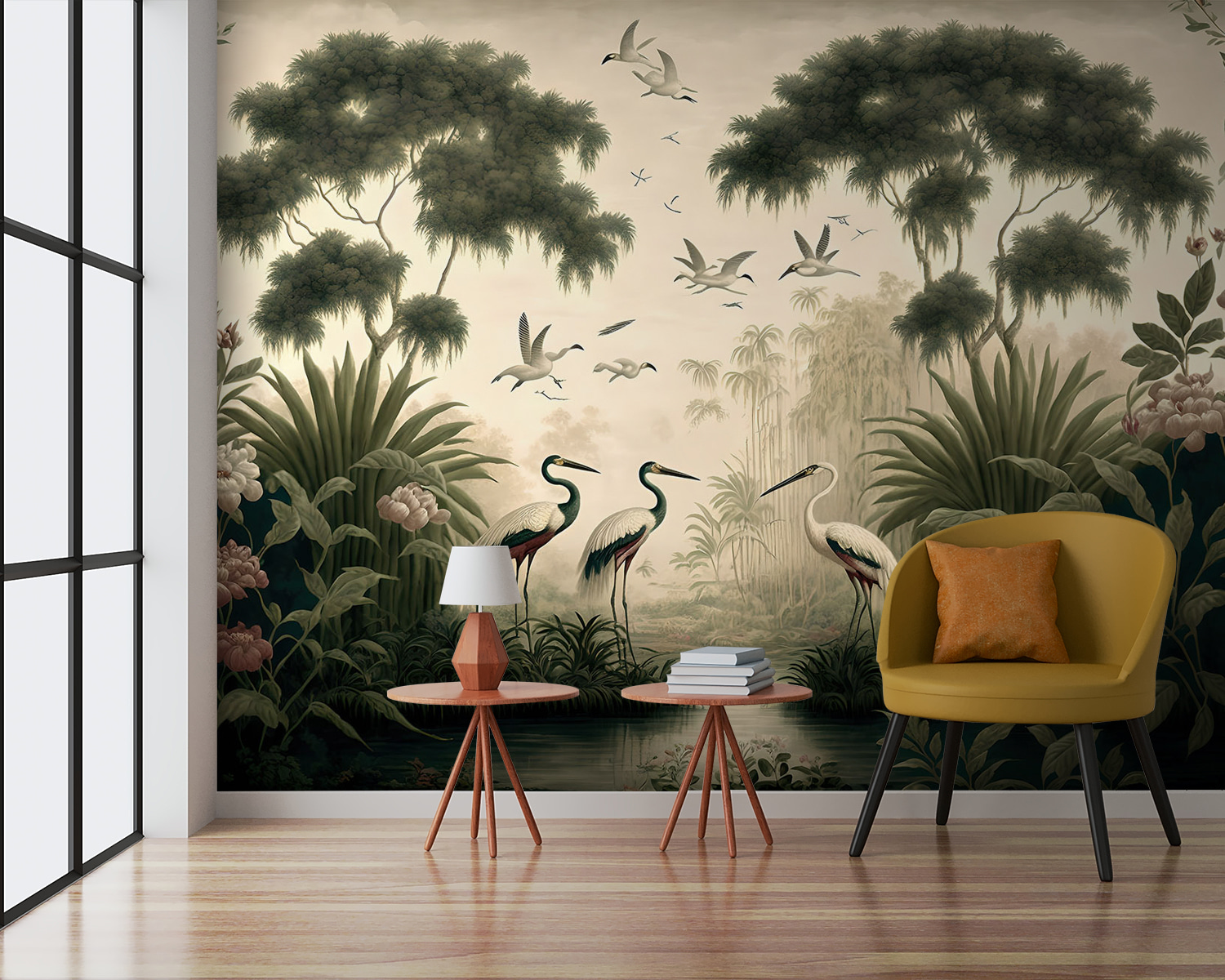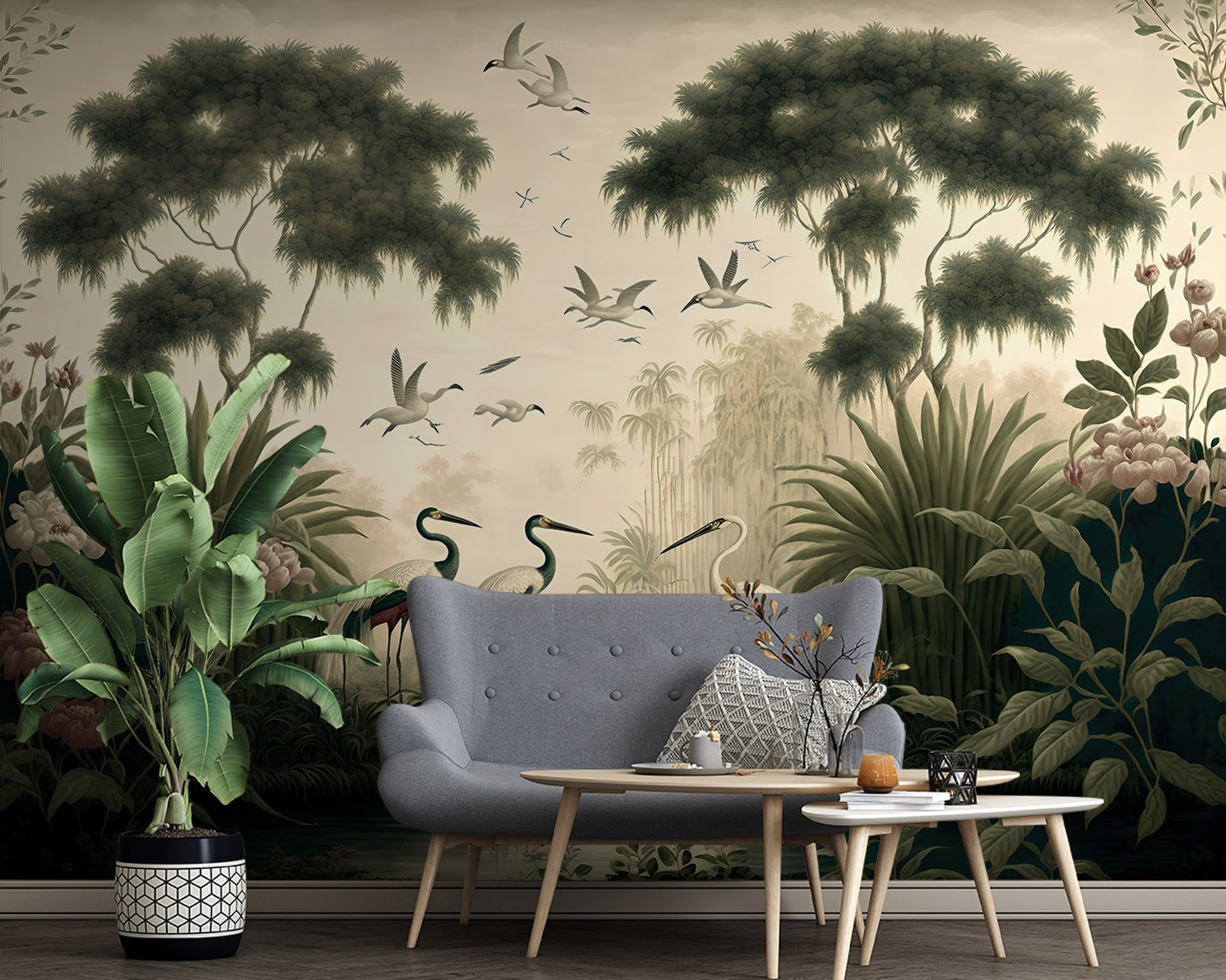 Kijk eens naar deze prachtige muurschildering “Vliegende vogels in de lucht”. Het is net alsof je in een dromerige natuurscène stapt vol elegante vogels, weelderige bomen en bloeiende bloemen. Perfect om een grillig en toch verfijnd tintje aan elke kamer te geven. Stel je voor dat je ‘s ochtends aan je koffie nipt met zo’n sereen uitzicht – het is bijna een minivakantie. De details zijn verbluffend, bijna alsof de vogels zo van de muur afvliegen. Ideaal voor natuurliefhebbers of iedereen die een beetje magie van het buitenleven naar binnen wil halen. Een instant sfeermaker en gespreksstarter, dat is zeker!