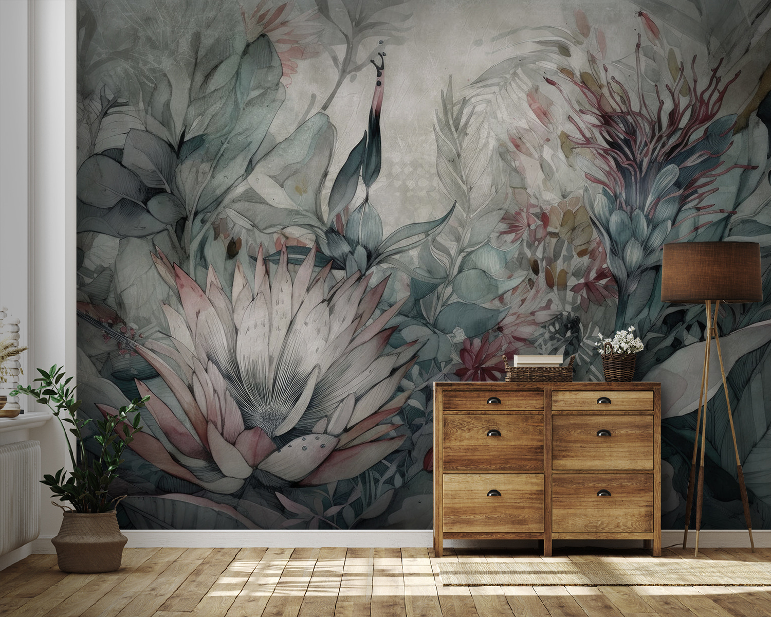 Deze muurschildering past precies in een boho-chique sfeer of zelfs in een moderne minimalistische stijl en voegt precies de juiste, op de natuur geïnspireerde kunst toe. Denk aan je ochtendkoffie – stel je nu voor dat je die drinkt omringd door deze serene, prachtige blos van botanische gelukzaligheid. Je kamer zal aanvoelen als een rustgevende ontsnapping, een plek waar je tot rust kunt komen en je gedachten de vrije loop kunt laten. En je vrienden zullen zeker een beetje jaloers zijn.