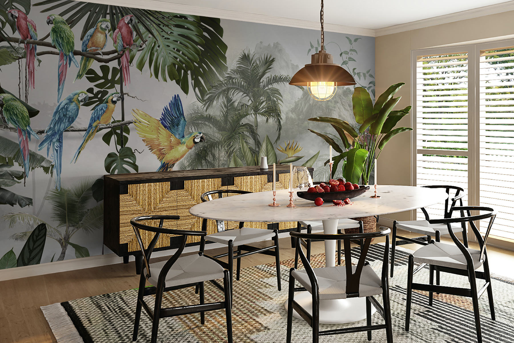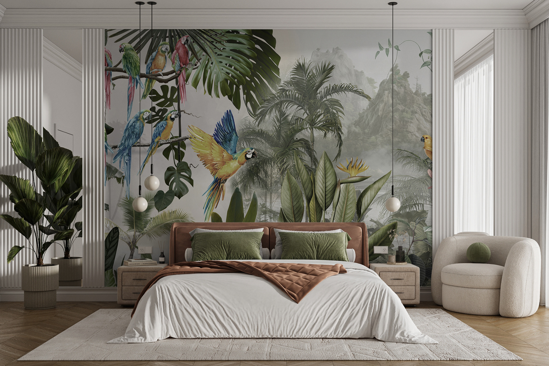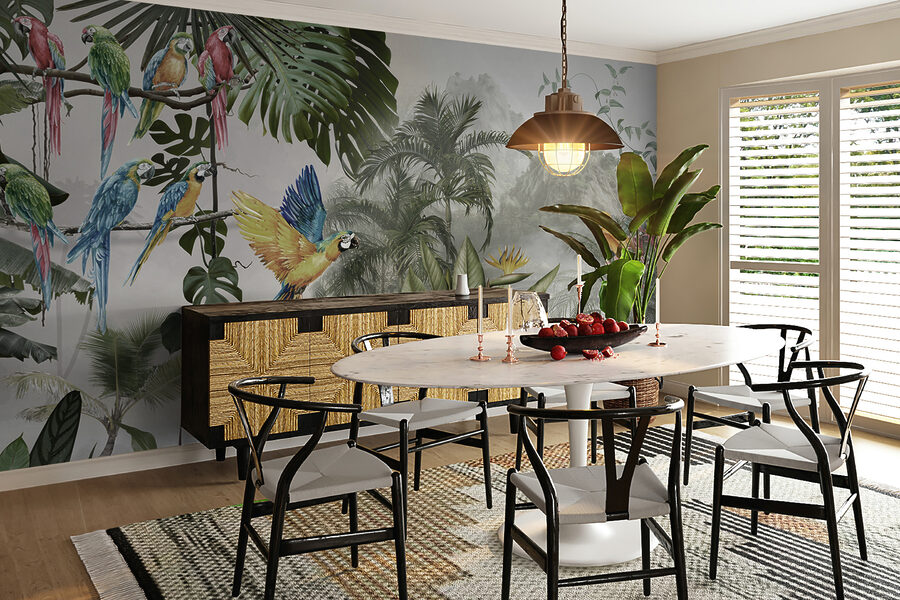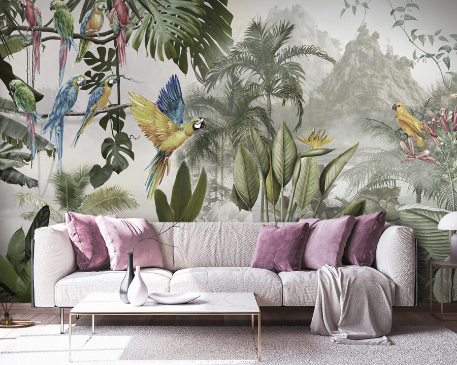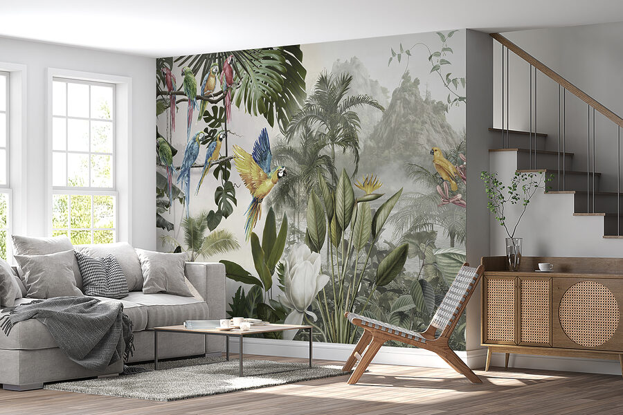 Verander elke muur in een levendige ontsnapping met deze prachtige muurschildering van kleurrijke papegaaien in volle vlucht. Stel je voor dat je een kamer binnenloopt waar deze gevederde vrienden door de lucht lijken te fladderen, waarbij elke krijs de allure van een tropisch paradijs weerkaatst. Het is alsof je een stukje natuur naar binnen haalt, zonder de vochtigheid. De weelderige bladeren en levendige bloemen geven de kamer een levendig gevoel en creëren een dromerige achtergrond die vreugde en warmte uitstraalt.