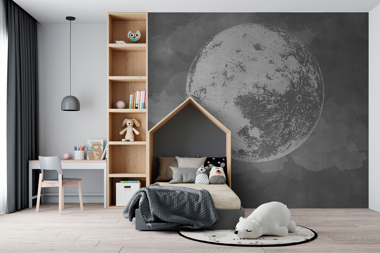 Transformeer elke kamer met de betoverende muurschildering “Textured Moon with Cloudy Backdrop”. Stel je voor dat je in een sereen nachtlandschap stapt waar dromerige wolken rond een stralende maan dansen. Het is alsof je een stukje van de kosmos als muur hebt! Of het nu een gezellige woonruimte is of een rustige slaapkamer, deze muurschildering brengt een kalme sfeer. Stel je voor dat je lekker gaat zitten met een goed boek, omringd door de zachte gloed van maanlicht. Het wakkert gesprekken aan en wekt emoties op, waardoor ruimtes levendig aanvoelen. Perfect voor dromers en sterrenkijkers, een artistieke ontsnapping aan de dagelijkse drukte. Laat de magie van de nacht je elke dag inspireren!
