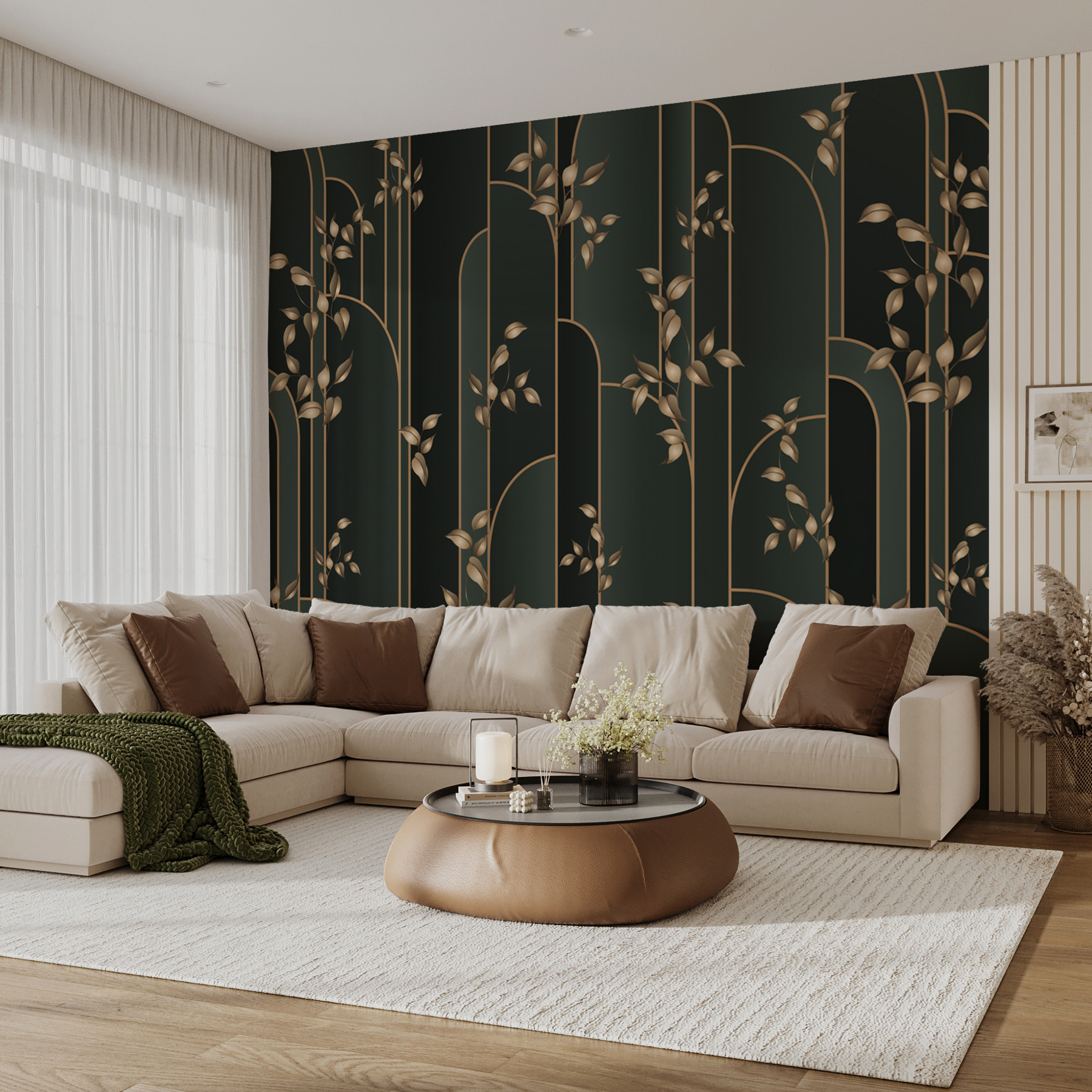 Verander elke kamer in een gezellige oase met deze muurschildering met elegante bladeren tegen een donker gestreepte achtergrond. Het is alsof je een sereen bos in huis haalt – zonder wandelschoenen! Stel je voor: een woonkamer of slaapkamer binnenstappen die zowel verfrissend als verfijnd aanvoelt. Het bladerrijke ontwerp voegt een vleugje natuur toe zonder de rommel, en die rijke achtergrond laat de details echt tot hun recht komen. Vrienden zullen zich afvragen of je een geheime tuin hebt. Perfect voor iedereen die een vleugje stijl en rust wil toevoegen aan zijn of haar ruimte!