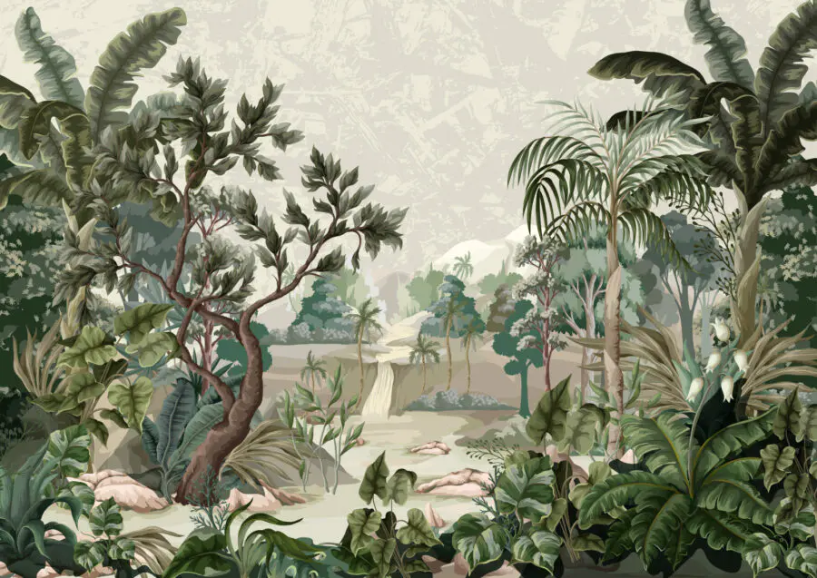Ooit van je woonkamer een rustgevende oase willen maken? Kijk dan eens naar deze muurschildering – het is net een instant, weelderig tropisch uitje. Weelderig groen, torenhoge bomen en een dromerige waterval. Het voelt alsof je vanuit je luie stoel een magische jungle binnenstapt. Stel je voor dat je gaat zitten met je ochtendkoffie en verdwaalt in dit rijke tapijt van bladeren en rust. Het is niet zomaar een muurschildering; het is een stukje sereniteit. Perfect voor iedereen die hunkert naar een beetje natuur binnenshuis. Geloof me, je zult niet stoppen met staren.