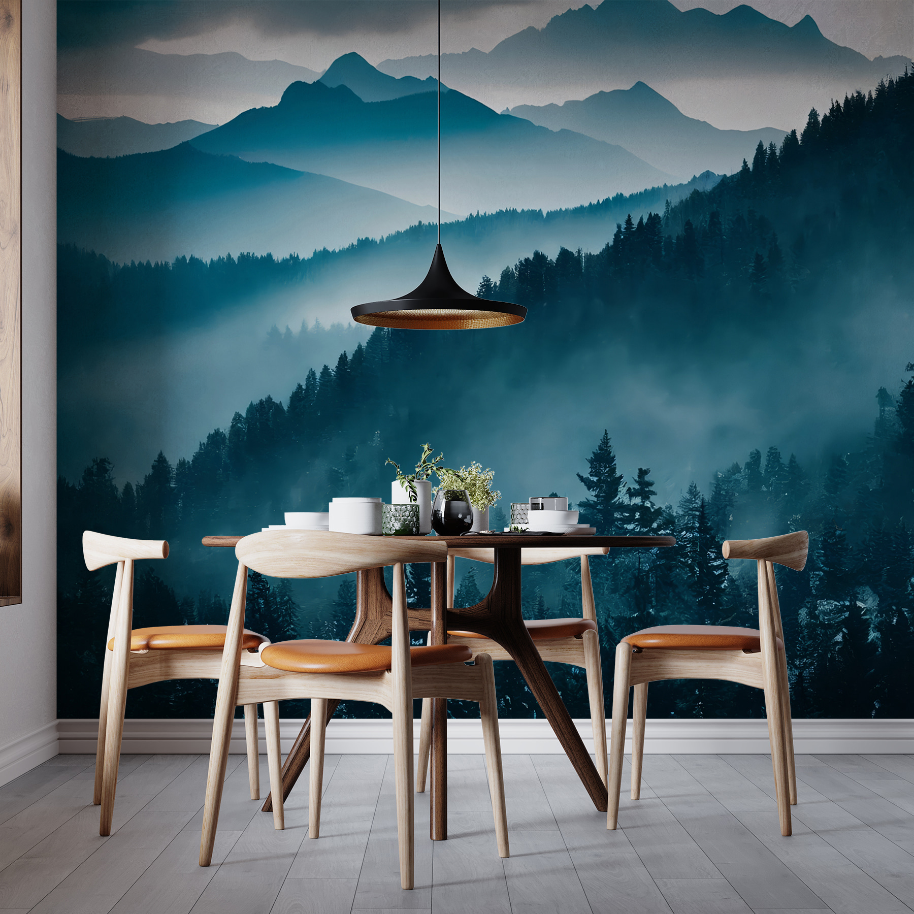Stel je voor: thuiskomen na een lange dag, je laarzen uittrekken en je verliezen in het vredige tafereel van deze muurschildering. Het is bijna alsof je aan de rand van een sereen bos staat en frisse berglucht inademt. Je kunt de stilte bijna voelen, het vage geruis van de sneeuwvlokken horen.