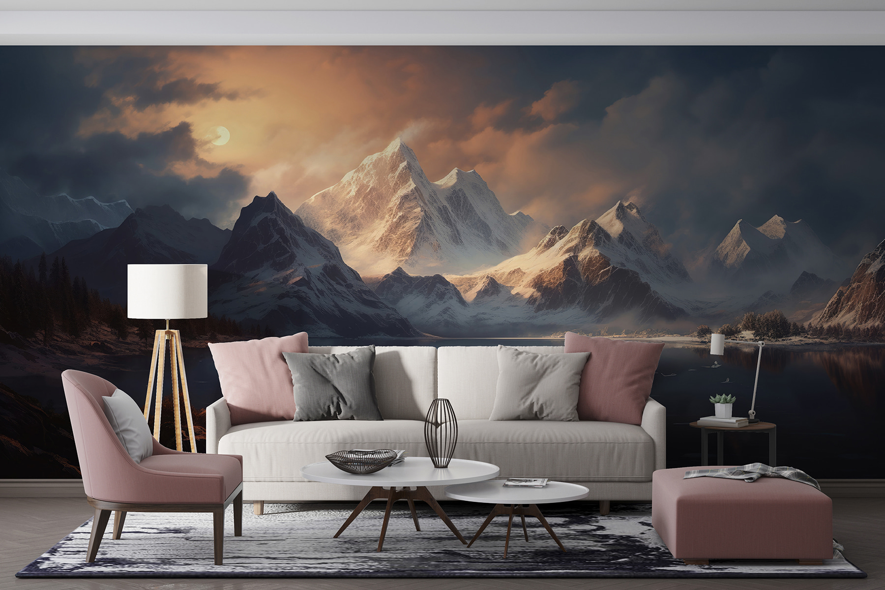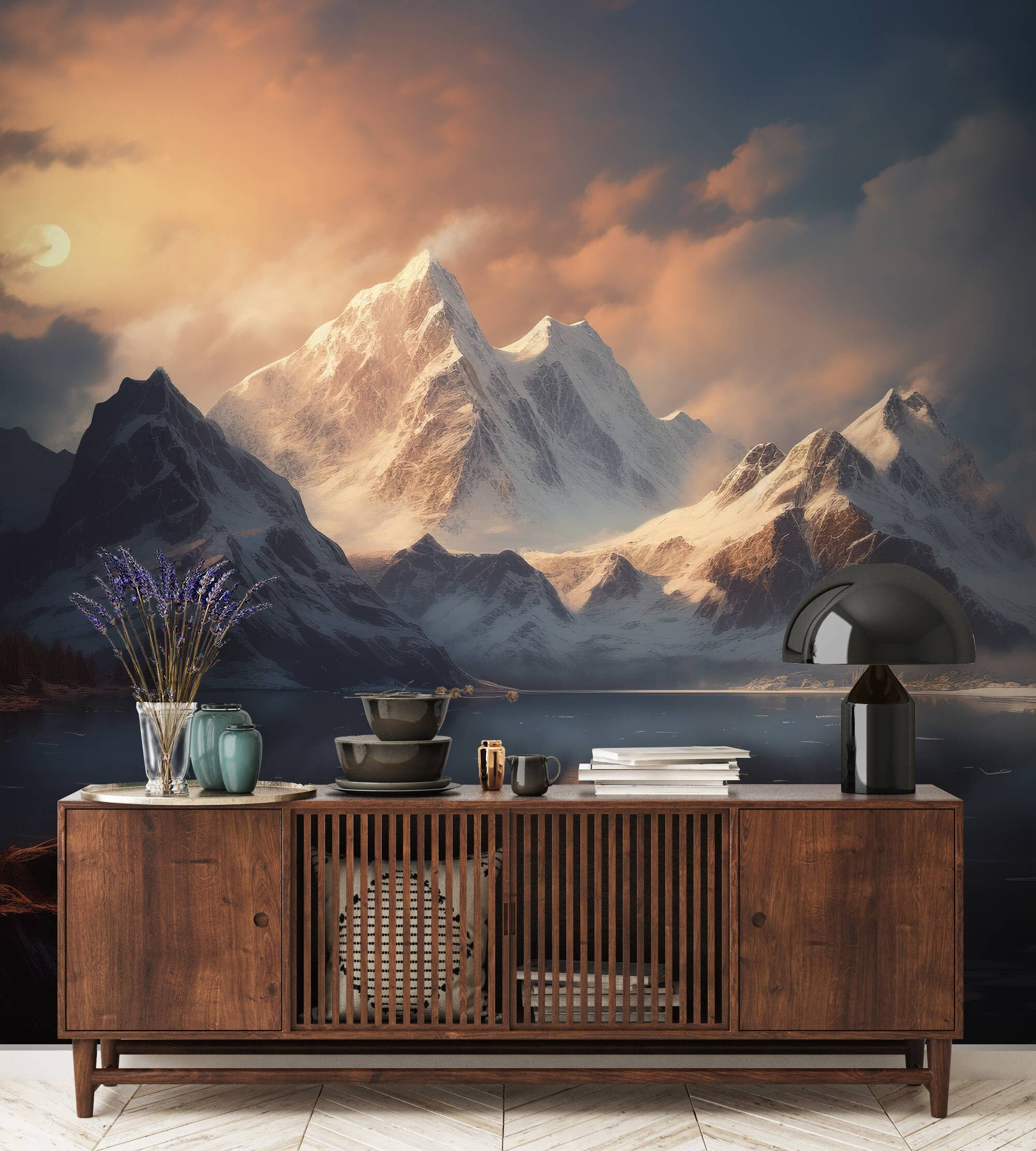 Stel je voor dat je een kamer binnenstapt en meteen de kilte voelt van een besneeuwde bergwind, gewoon in je eigen huis. Deze muurschildering “Besneeuwde bergketen met wolken” is alsof je een venster hebt op de majestueuze Rockies (zonder de bevriezing). De bergen zijn zo helder en dramatisch dat ze bijna zelf een verhaal vertellen. Perfect om een vleugje magie van de bergen toe te voegen aan elke ruimte – een beetje zoals een mini-vakantie elke keer dat je langsloopt. Of je nu een liefhebber bent van het buitenleven of gewoon een prachtige achtergrond nodig hebt voor je gezellige avonden, deze muurschildering zal je ruimte zeker doen stralen en een serene ontsnapping bieden.