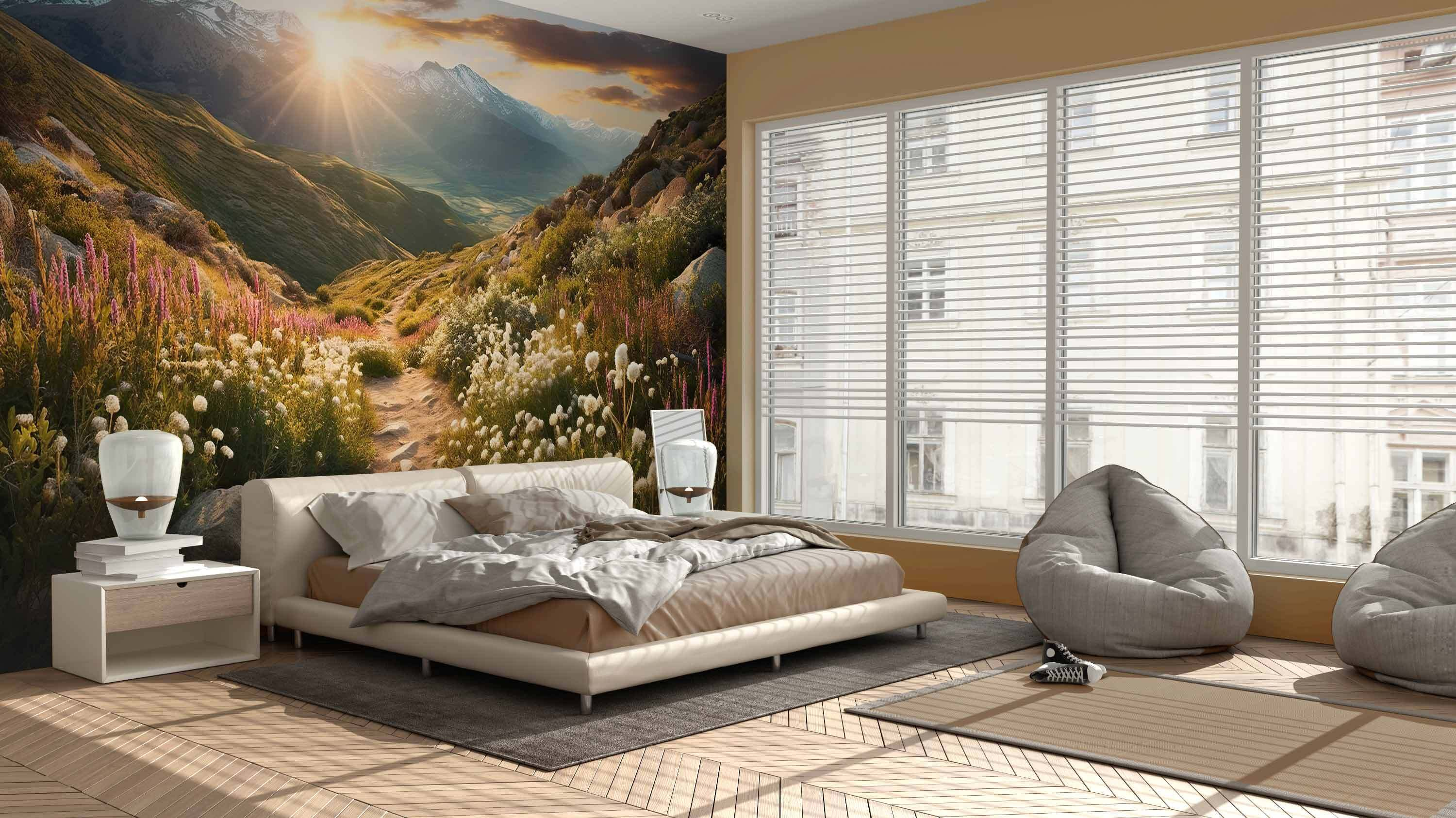 Verander een saaie ruimte in een dromerig toevluchtsoord met de “Fotobehang Sunset Over Mountain Flower Trail. Stel je voor dat je in een serene wereld stapt waar levendige wilde bloemen dansen in de wind en majestueuze bergen zich eindeloos uitstrekken. Deze muurschildering nodigt je uit om dieper adem te halen, de warmte van een zonsondergang te voelen en de rust van de natuur thuis te omarmen.