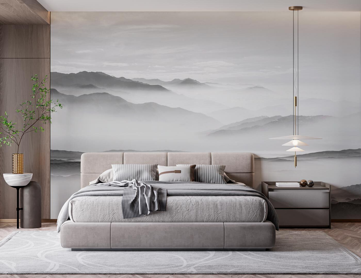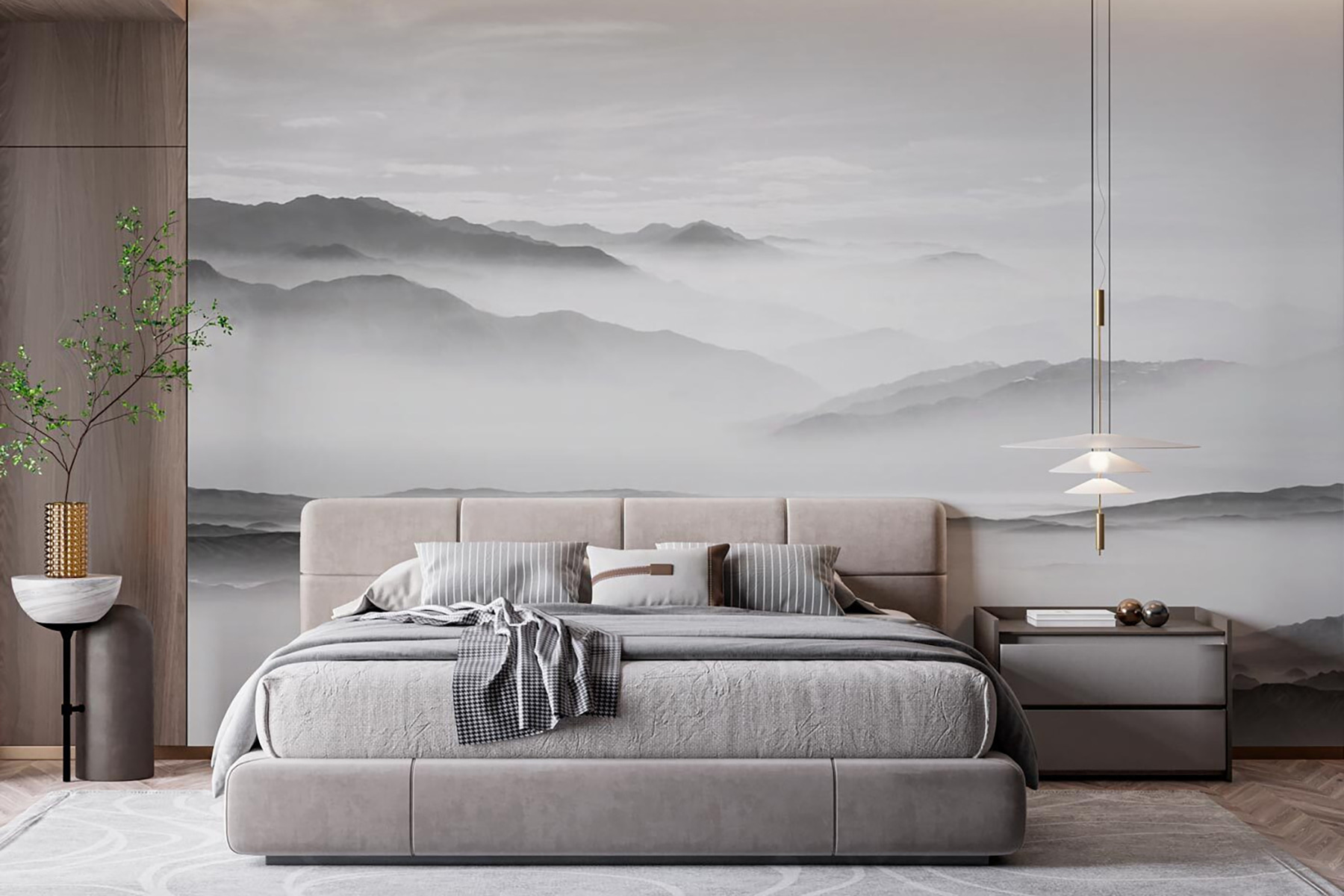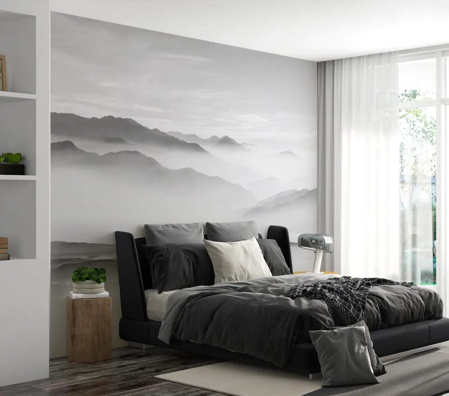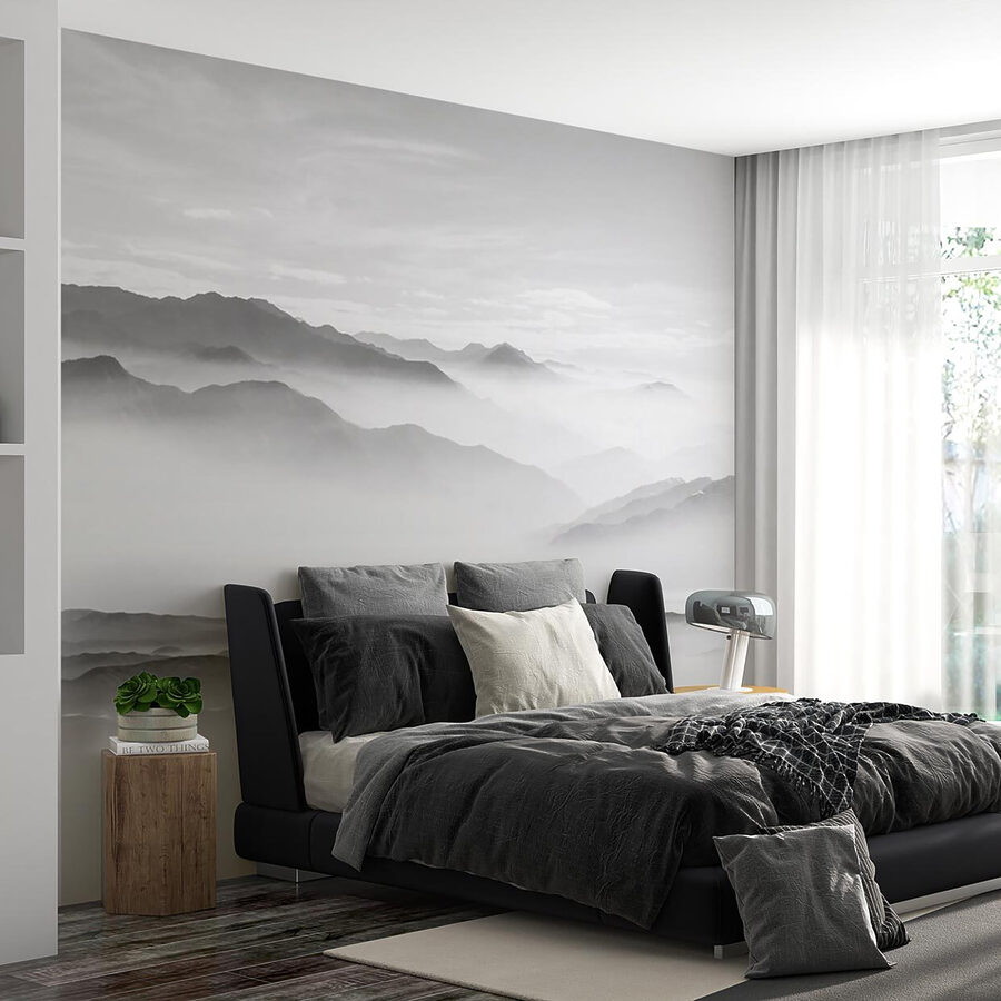 De subtiele grijstinten creëren een rustgevende sfeer, die je bijna uitnodigt om aan een warme kop thee te nippen terwijl je uit het raam wegdroomt. Het ene moment zit je midden in de drukte van de stad en het volgende moment ben je verdwaald in een stille bergnevel. Het is een geweldige gespreksstarter en wie wil zijn muur niet delen met een beetje magie van de natuur? Deze muurschildering gaat niet alleen over decor; het gaat over het creëren van een ruimte die aanvoelt als een frisse wind.