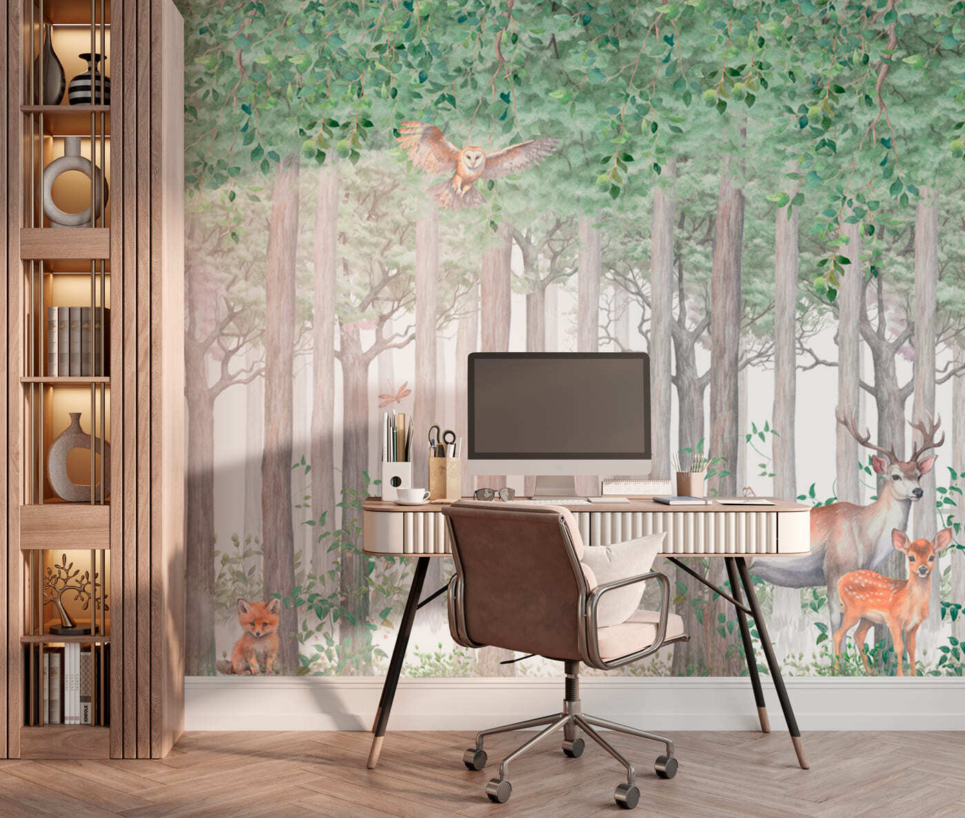 Droom je van een magisch bos in je woonkamer? Zoek dan niet verder! Deze muurschildering, getiteld “Muurschilderingen Groep dieren in een bos”, is alsof je een betoverend bos binnenstapt. Stel je voor dat je wakker wordt met zachte herten, nieuwsgierige vossen en een uil die sierlijk door de bomen glijdt. De zachte, natuurlijke kleuren kunnen je ruimte en je ziel tot rust brengen. Het is ideaal voor natuurliefhebbers en voegt een vleugje wildernis toe zonder dat er echt wilde dieren nodig zijn. En hé, er is zelfs een vintage fiets verstopt tussen de bomen, hoe charmant is dat? Tover elke kamer om in je eigen kleine toevluchtsoord in het bos.