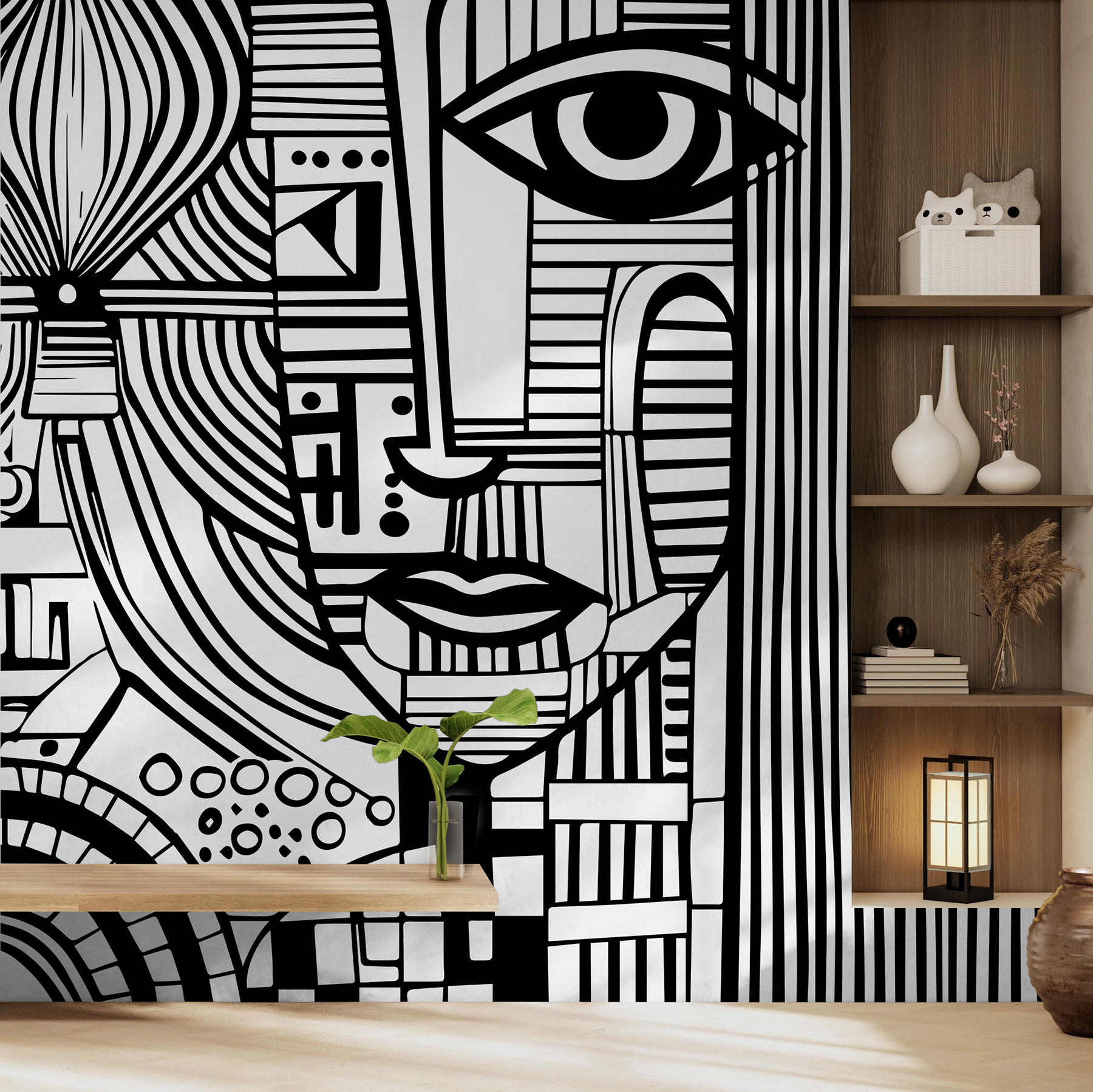 Wil je je muur wat serieuze stijlpunten geven? Kijk dan eens naar deze zwart-wit muurschildering. Het is alsof kunst elegantie heeft ontmoet en deze prachtige afbeelding heeft gemaakt. Je ziet het gezicht van een vrouw in een moderne, abstracte tekening die zowel gedurfd als ingewikkeld is. Stel je voor dat je thuiskomt en dit aan je muur ziet hangen – een echte showstopper, toch? Het is een combinatie van klassiek monochroom en scherp design. Perfect voor mensen die een beetje ‘wow’ in hun ruimte willen brengen. Of het nu de woonkamer, slaapkamer of zelfs een kantoor is, deze muurschildering kan elke plek omtoveren tot een artistieke oase. En serieus, het is niet zomaar behang, het is een middelpunt, een conversatiestarter. De gedetailleerde lijnen en vormen nodigen je zelfs uit om elke keer als je er naar kijkt nieuwe aspecten te ontdekken. Het is het soort decor waarvan gasten zeggen: “Waar heb je dat vandaan?!” Ideaal om een unieke stijlvolle achtergrond te creëren zonder de rest te overheersen. Dus waarom genoegen nemen met effen muren als je ook een meesterwerk kunt hebben?