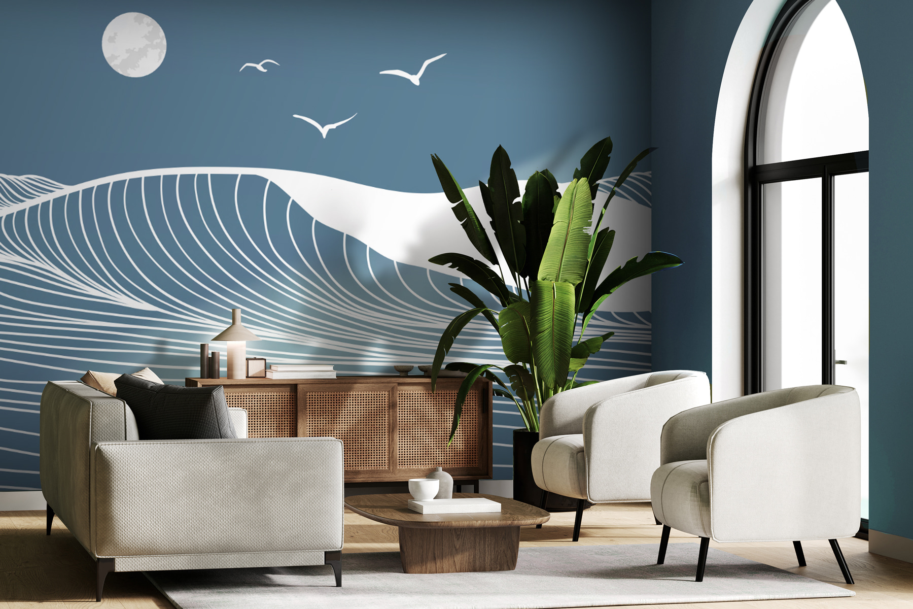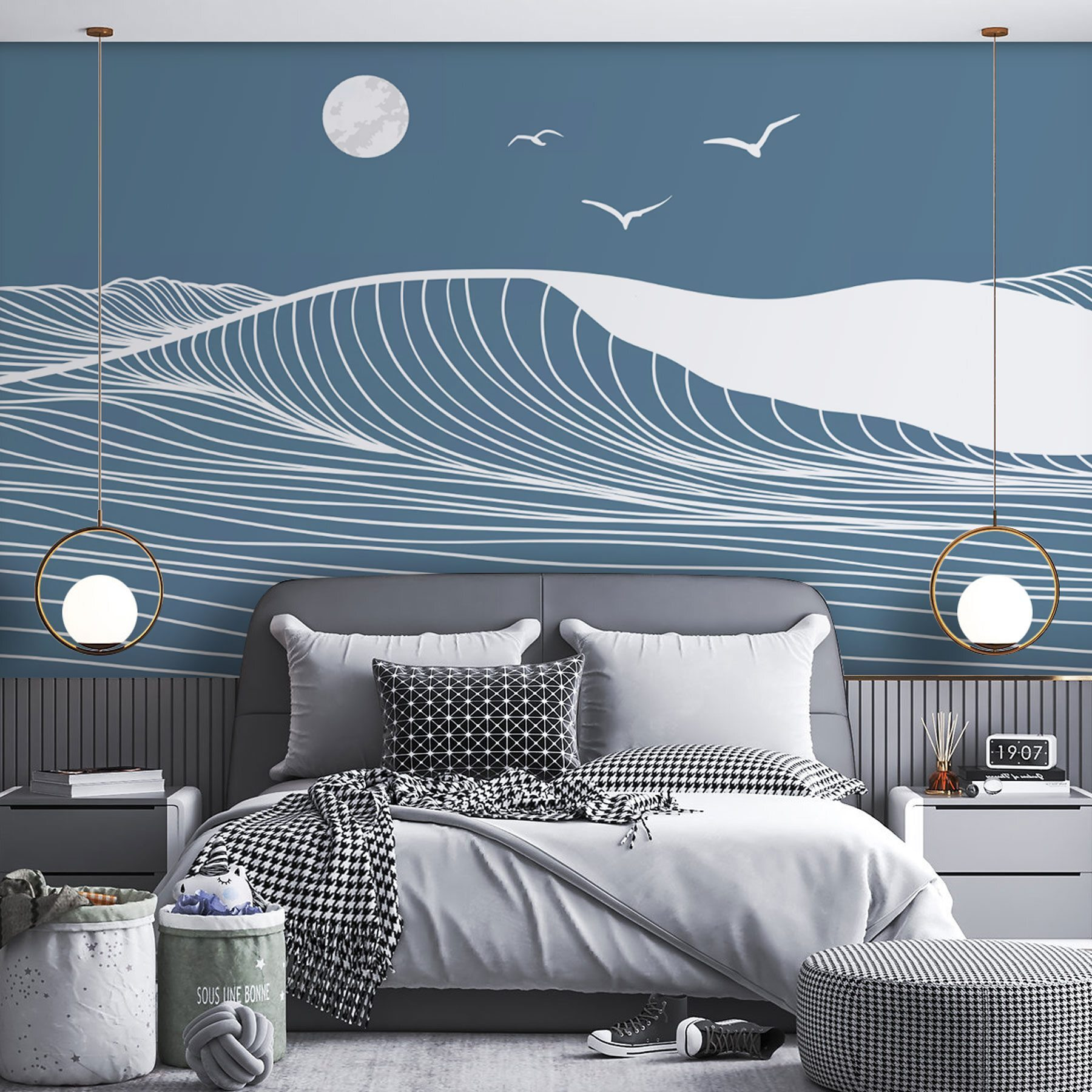 Bekijk deze prachtige muurschildering “Witte lijnen op een blauwe achtergrond”. Stel je dit eens voor in je woonkamer of kantoor. Het is alsof je in een dromerige blauwe afgrond staart. Die wervelende witte lijnen? Ze doen je een beetje denken aan zachte golven, nietwaar? Het heeft een vredige uitstraling, bijna alsof je op een sereen strand bent bij zonsondergang. Perfect voor ruimtes waar je een vleugje rust en creativiteit wilt toevoegen. Of je nu een saaie muur wilt opvrolijken of een centraal punt wilt creëren, met deze muurschildering zit je goed. Duik elke keer dat je er een glimp van opvangt de rust in. Voelt als een hap frisse zeelucht, toch? 🌀🌊