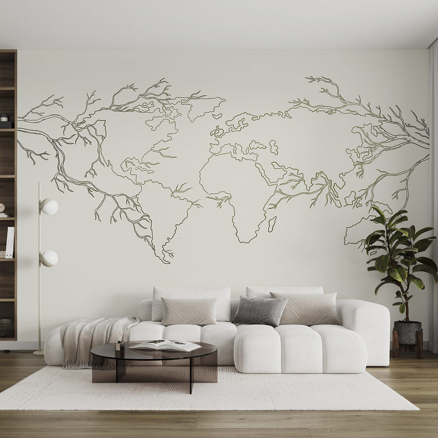 “Fotobehang Map of the World” is geen gewoon behang. Stel je voor dat je je kamer een vleugje reislust geeft met dit unieke ontwerp met delicate takken die de continenten vormen. Perfect voor een kinderkamer of je eigen speciale hoekje, het is alsof je een klein avontuur op je muur hebt – zonder de jetlag.