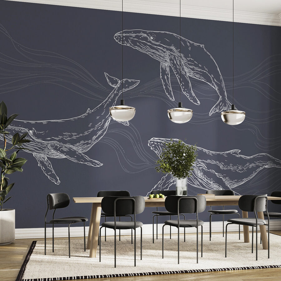 Stel je voor dat je een kamer binnenloopt en begroet wordt door een majestueuze groep walvissen die sierlijk over je muur zwemt. Dat is precies de sfeer die deze muurschildering uitstraalt – rustgevend en toch een beetje avontuurlijk. Ideaal voor elke ruimte die een beetje magie van de oceaan nodig heeft. Walvissen zwemmen namelijk niet alleen, ze glijden ook. Deze muurschildering geeft die elegantie weer en laat je muren tot leven komen. Perfect voor een kamer met een strandthema of gewoon om een vleugje zee toe te voegen waar je het het minst verwacht. Plus, die zachte lijnen en golven… puur artistiek genot! Duik erin en laat deze prachtige wezens je ruimte omtoveren tot een onderwaterparadijs.