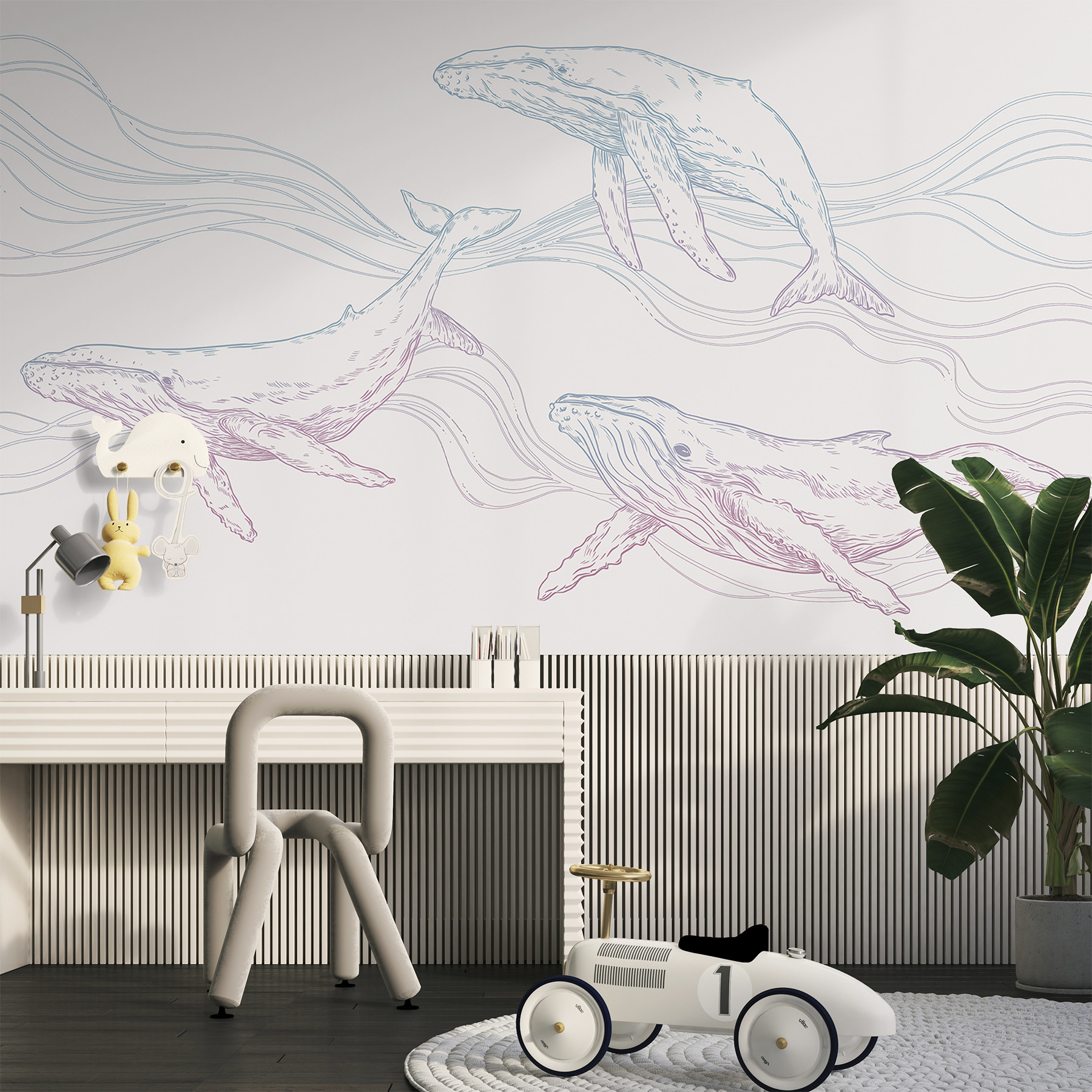 Tover elke kamer om in een ontsnapping aan de oceaan met deze prachtige muurschildering met een groep walvissen die sierlijk door het water zwemmen. Stel je voor dat je wakker wordt met de zachte, rustgevende aanwezigheid van deze majestueuze wezens, die stuk voor stuk herinneren aan de schoonheid van het diepe blauw. De zachte, vloeiende lijnen en pasteltinten creëren een serene sfeer – perfect voor een gezellige woonkamer of een rustgevende slaapkamer. Het is alsof je een stukje van de zee thuis hebt. Vrienden zullen zich vergapen aan de kunst, en wie zou zich niet een beetje meer ontspannen voelen omringd door de reuzen van de natuur? Duik in een wereld die de wonderen van de oceaan naar je dagelijks leven brengt.