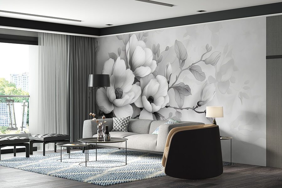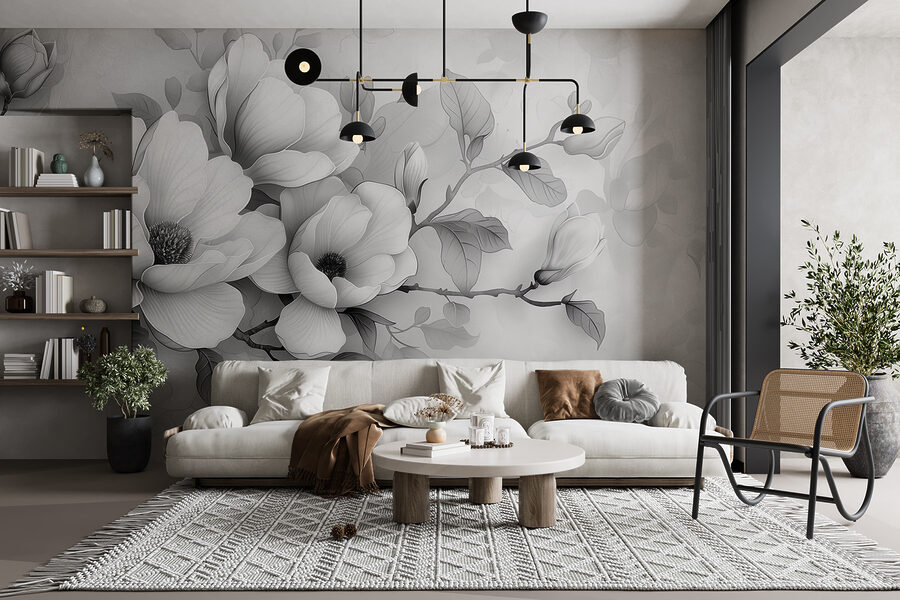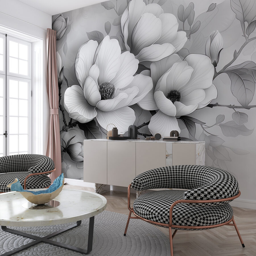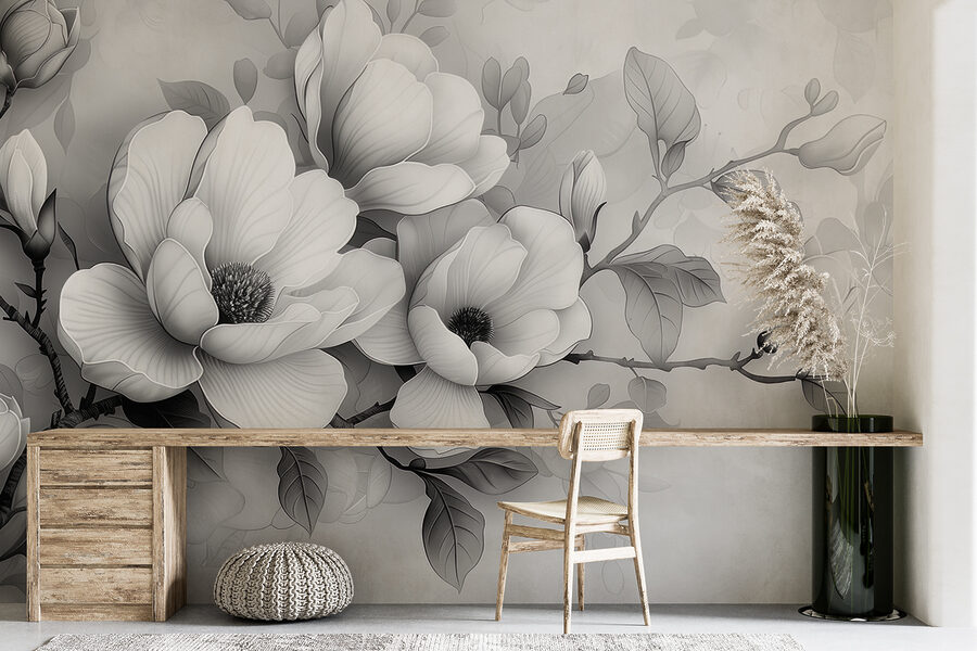 Transformeer elke ruimte met deze prachtige muurschildering, “Monochrome Bloom in Serene Elegance”. Stel je een vredige ochtend voor met licht dat naar binnen stroomt en deze delicate bloemen die zachtjes je muur sieren. Het gedurfde maar toch zachte ontwerp brengt moeiteloos raffinement in balans met de schoonheid van de natuur. Het is alsof je een rustige tuin in huis haalt, perfect om in weg te dromen of gezellig te kletsen. Of het nu een chique woonkamer is of een rustig hoekje in een slaapkamer, deze muurschildering fluistert elegantie zonder te schreeuwen. Het is een charmante toets die je doet stilstaan, adem doet halen en de kunst van de eenvoud laat waarderen. Stel je voor dat je een kopje koffie drinkt in de buurt en de serene sfeer over je heen voelt komen.