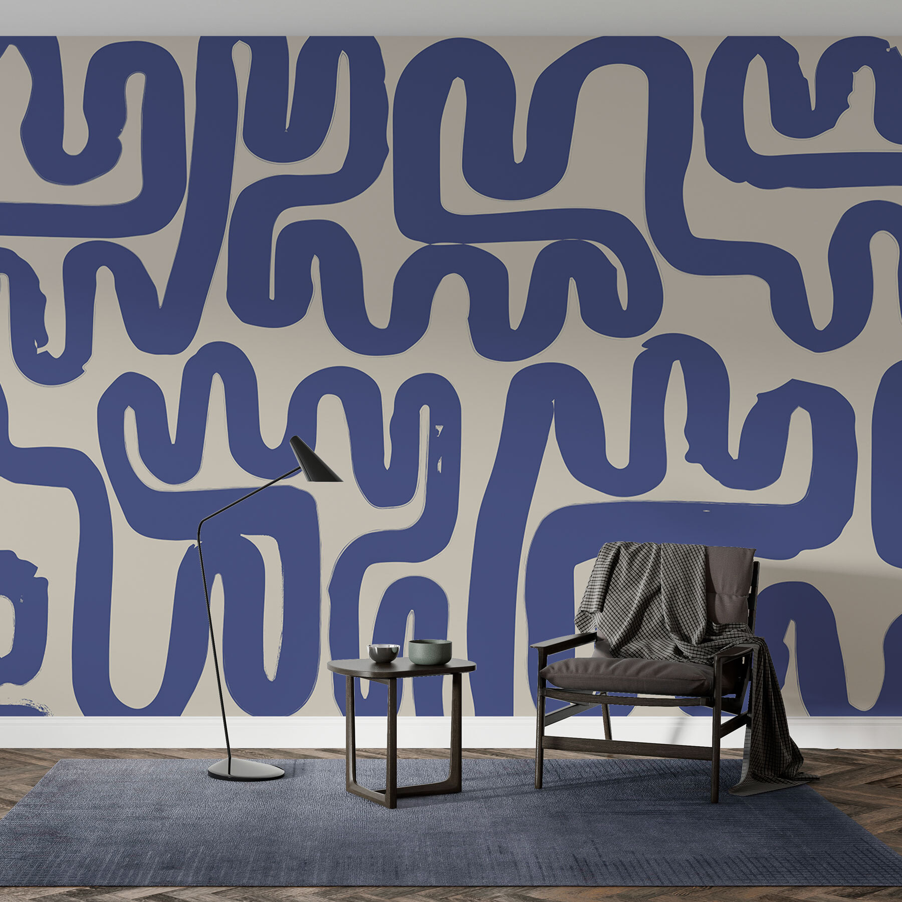 Fleur elke kamer op met deze speelse muurschildering met gedurfde blauwe lijnen die dansen op een kraakheldere witte achtergrond. Het is net een moderne kunsttentoonstelling zonder de prijs van een kaartje. Stel je voor dat je je woonkamer binnenloopt en daar is het, meteen een oppepper voor je humeur. De eigenzinnige patronen nodigen het oog uit om rond te dwalen, waardoor een gesprek op gang komt en misschien zelfs een paar keer gegiecheld wordt. Perfect voor een lounge of een creatief hoekje, het brengt een vleugje plezier dat zowel fris als toegankelijk aanvoelt. Of je nu koffie drinkt of gezellig zit te lezen, deze muurschildering geeft je de juiste sfeer. Voeg een vleugje eigenzinnigheid toe aan je muren en laat de goede tijden rollen!