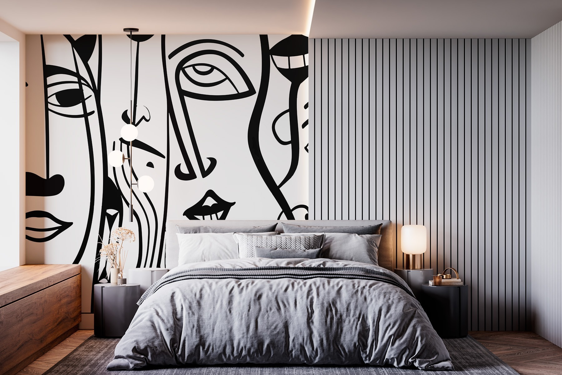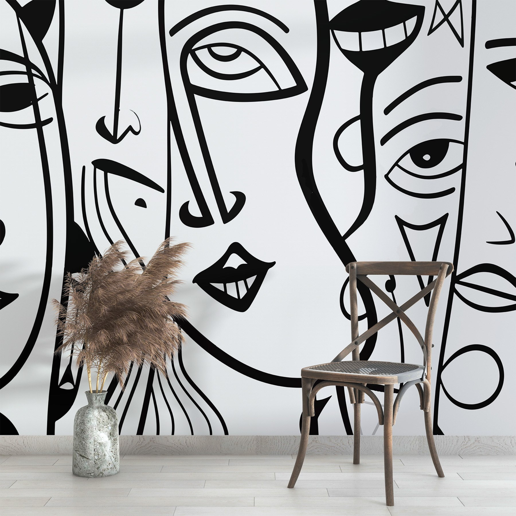 Transformeer je ruimte met deze boeiende zwart-wit muurschildering met een mix van expressieve gezichten. Het is alsof je een kunstgalerie in je woonkamer hebt, maar dan zonder de pretentieuze sfeer. De gedurfde lijnen en speelse vormen nodigen uit tot een gesprek – stel je voor dat vrienden midden in een zin stoppen om de muurschildering te bewonderen, terwijl ze proberen de emoties te ontcijferen die in die eigenzinnige uitdrukkingen verstopt zitten.