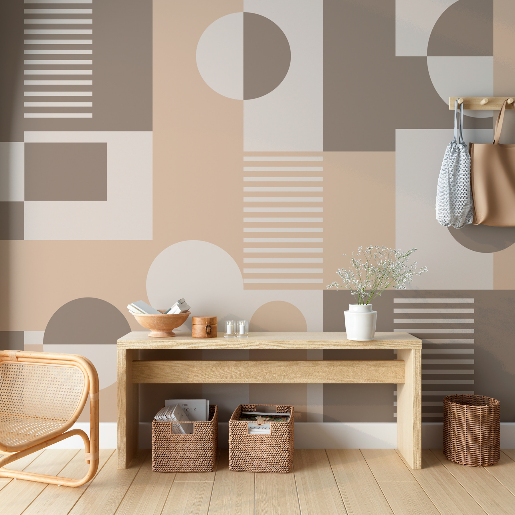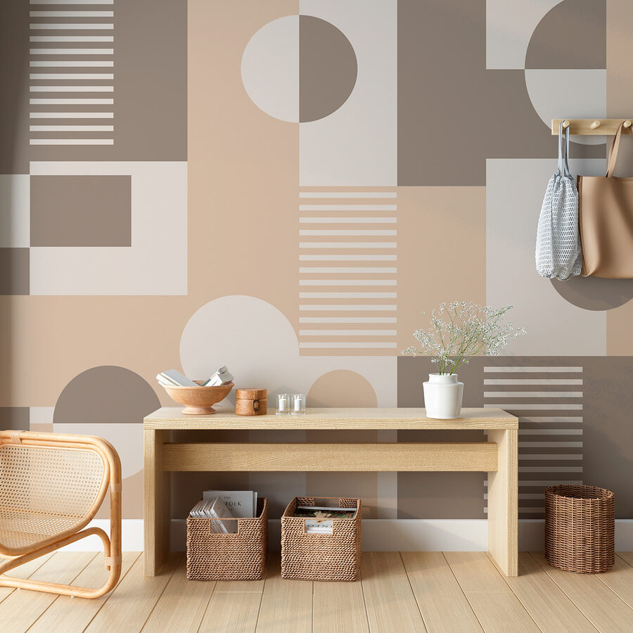 Transformeer elke kamer met deze stijlvolle muurschildering met een speelse mix van geometrische vormen. De zachte, aardse tinten creëren een rustgevende sfeer, perfect voor ontspannen avonden of vrolijke bijeenkomsten. Stel je voor dat je aan je koffie nipt terwijl het licht door de strakke lijnen danst, waardoor de ruimte levendig aanvoelt. Elke vorm lijkt een klein verhaal te vertellen – waar komt die cirkel vandaan? Is het een maan? Een gezellig ontbijtbord? Perfect voor een woonkamer of thuiskantoor, het stimuleert creativiteit zonder de zintuigen te overweldigen. Het is net een modern kunstwerk, maar dan veel makkelijker op te hangen!