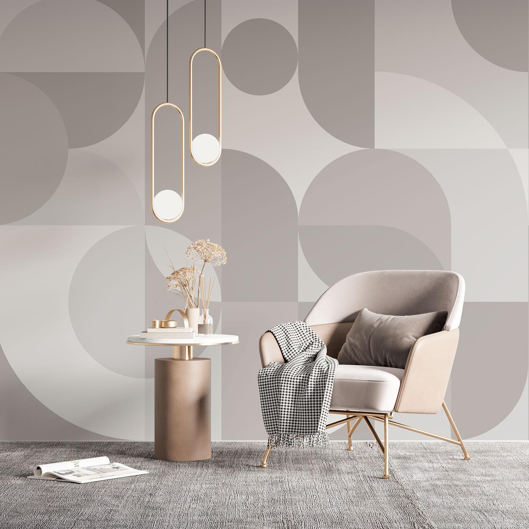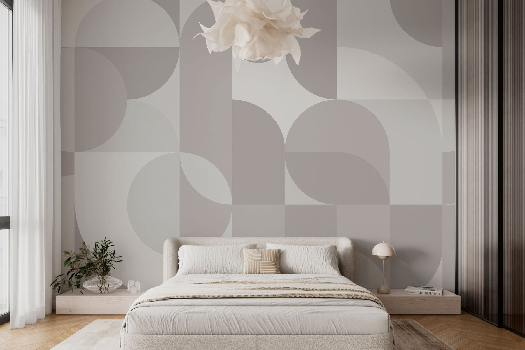Verander uw ruimte in een stijlvol toevluchtsoord met deze grijze en witte geometrische muurschildering. Het is als een gezellige knuffel voor uw muren, waarbij moderne verfijning en speelse patronen worden gecombineerd. Stelt u zich eens voor: een zonnige middag, vrienden die samenkomen en ieders ogen die naar die prachtige achtergrond afdwalen – dat zal ongetwijfeld tot levendige gesprekken leiden! De zachte tinten creëren een rustgevende sfeer, perfect om te relaxen met een boek of gewoon om weg te dromen. Bovendien is het een perfect canvas voor uw eclectische interieur. Wie had gedacht dat muren zo intrigerend konden zijn?