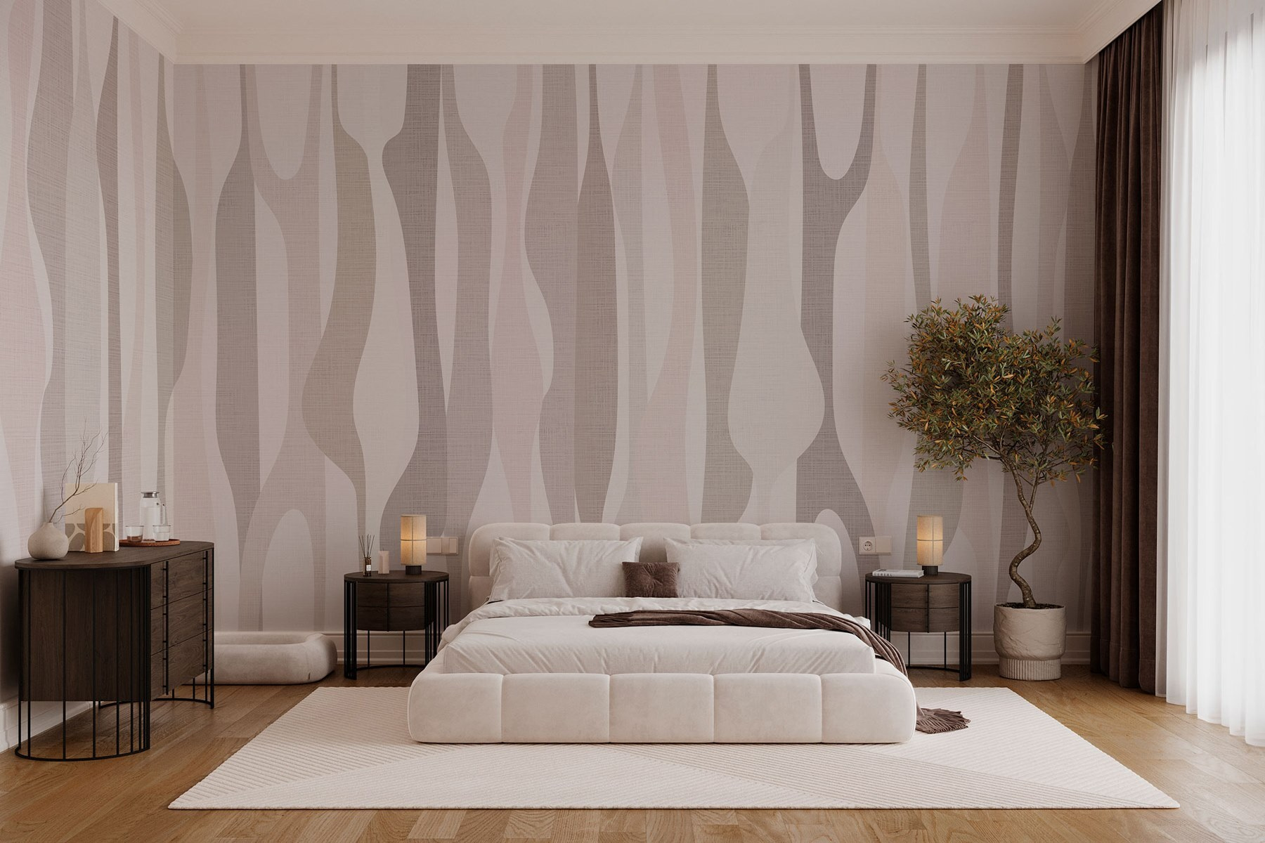 Stel je voor dat je een kamer binnenstapt waar de muren ademen met zachte, vloeiende lijnen in zachte neutrale tinten. Deze muurschildering creëert een rustgevende achtergrond die aanvoelt als een warme knuffel. Perfect voor rustige ochtenden met een kop koffie of gezellige avonden met een goed boek. Het ontwerp voegt een vleugje moderne stijl toe zonder om aandacht te schreeuwen – gewoon een heerlijk gefluister van elegantie. Stel je een ruimte voor waar stress wegsmelt en creativiteit stroomt. Het is alsof je een stukje rust op je muren hebt, dat moeiteloos in elk interieur past. Geloof me, deze muurschildering kan een saaie kamer veranderen in een serene ontsnapping.