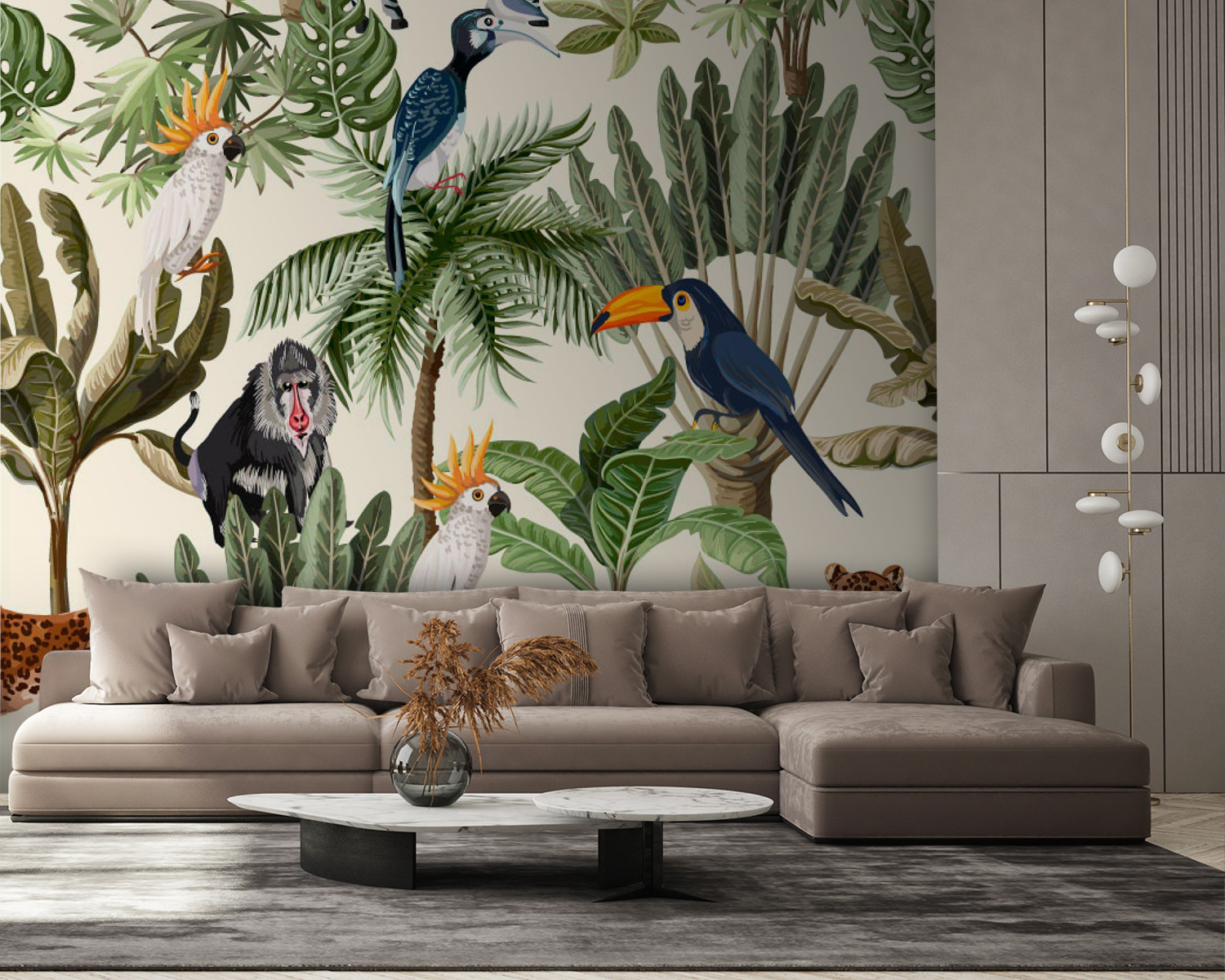 Tover elke kamer om in een tropisch paradijs met deze levendige muurschildering met charmante planten en exotische vogels, perfect voor wie houdt van een vleugje kleur! Stel je voor dat je je kamer binnenloopt en het gevoel hebt dat je bent meegenomen naar een weelderige jungle. De speelse combinaties van papegaaien, luipaarden en andere levendige dieren nodigen uit tot avontuur. Het is alsof je een stukje natuur in huis haalt, zonder de beestjes! Deze muurschildering is geweldig voor een kinderkamer, woonkamer of waar dan ook waar wel wat vrolijkheid kan gebruiken. Het is onweerstaanbaar!
