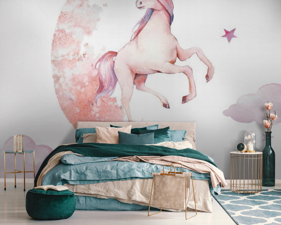 Transformeer elke ruimte met deze grillige muurschildering met een eenhoorn die elegant over de maan springt. Perfect voor kinderkamers of iedereen met een zwak voor magie, het voegt een vleugje verwondering toe aan de muren. Stel je gezellige avonden voor met het lezen van verhaaltjes voor het slapengaan, de zachte aanwezigheid van de eenhoorn inspireert tot dromen over betoverde landen en zachte wolken. De speelse roze tinten en de dromerige nachtelijke sfeer zullen je zeker vrolijk maken. Wie wil er nou niet een beetje magie in huis? Het is alsof je een stukje van een sprookje in huis hebt, wachtend om avontuur te inspireren!